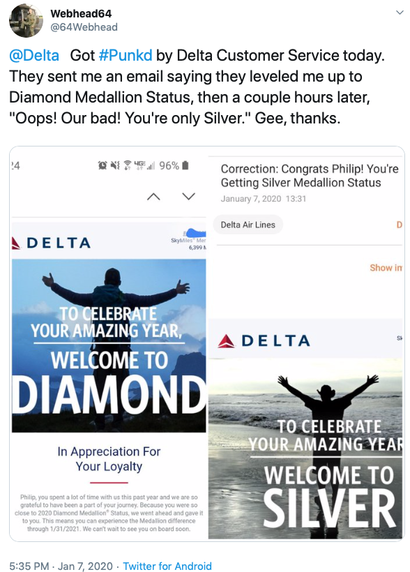 Delta accidentally gives some Diamond Medallion status and then takes it away