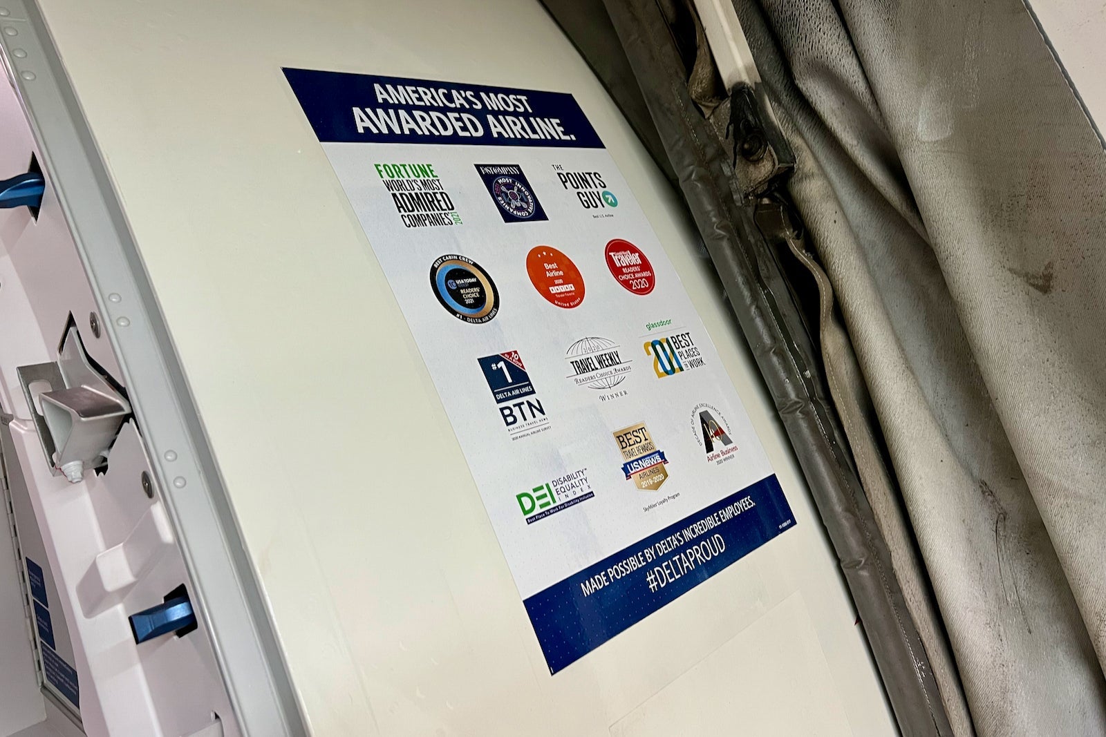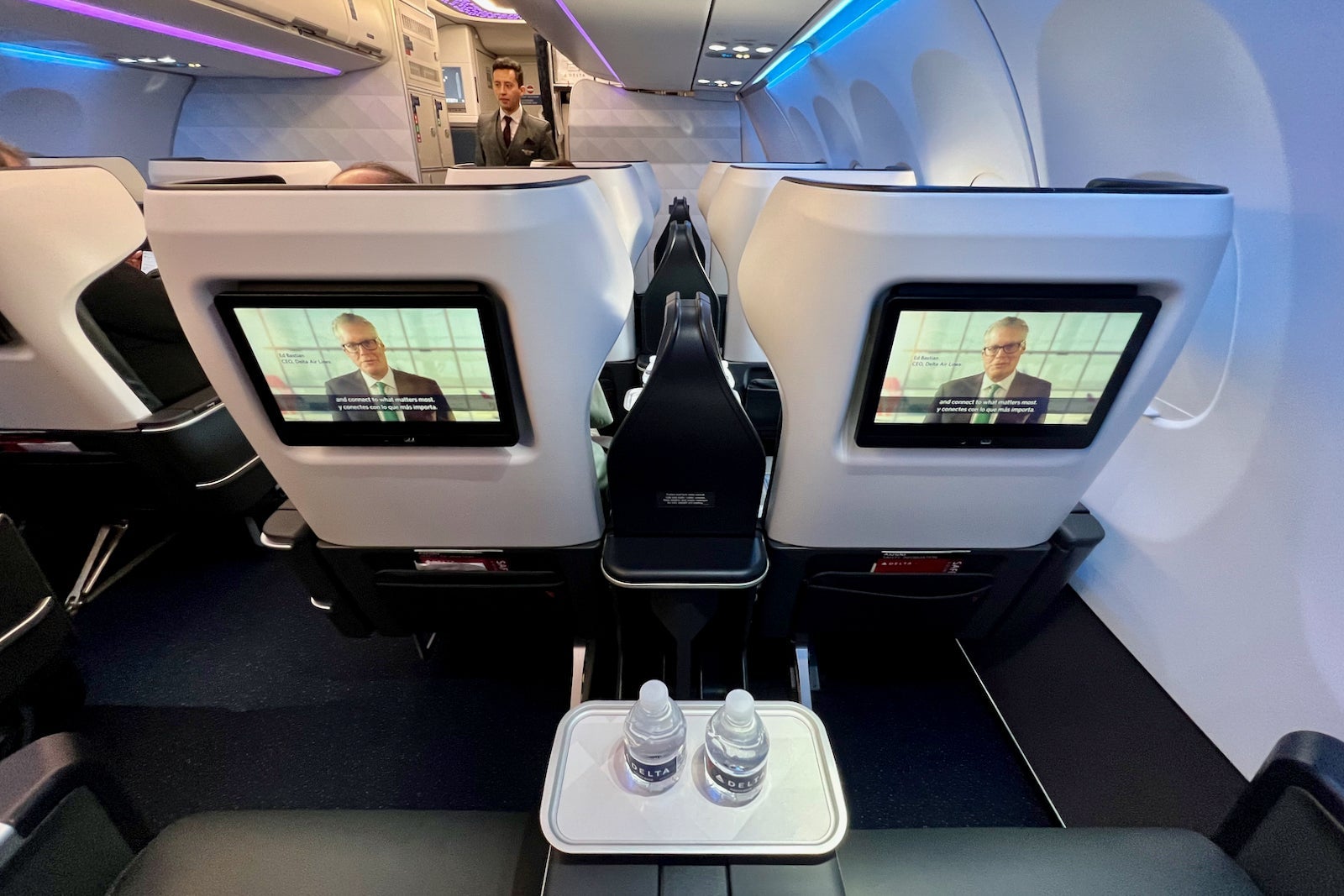 While the seat-back screens feature an updated inflight entertainment system produced by the airline's Delta Flight Products start-up, the safety video that was screened was Delta's pandemic-era version featuring masked flight attendants and actors.