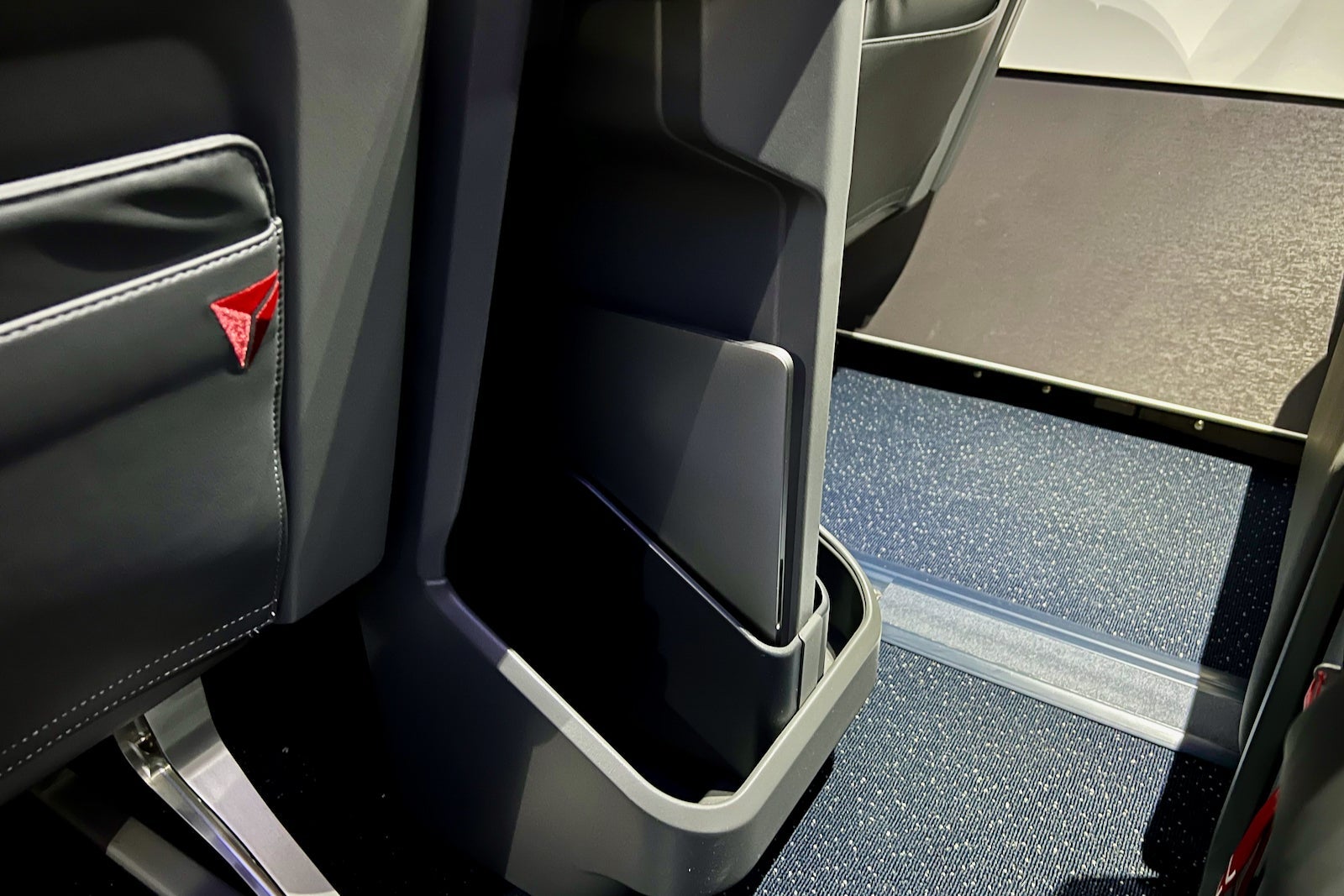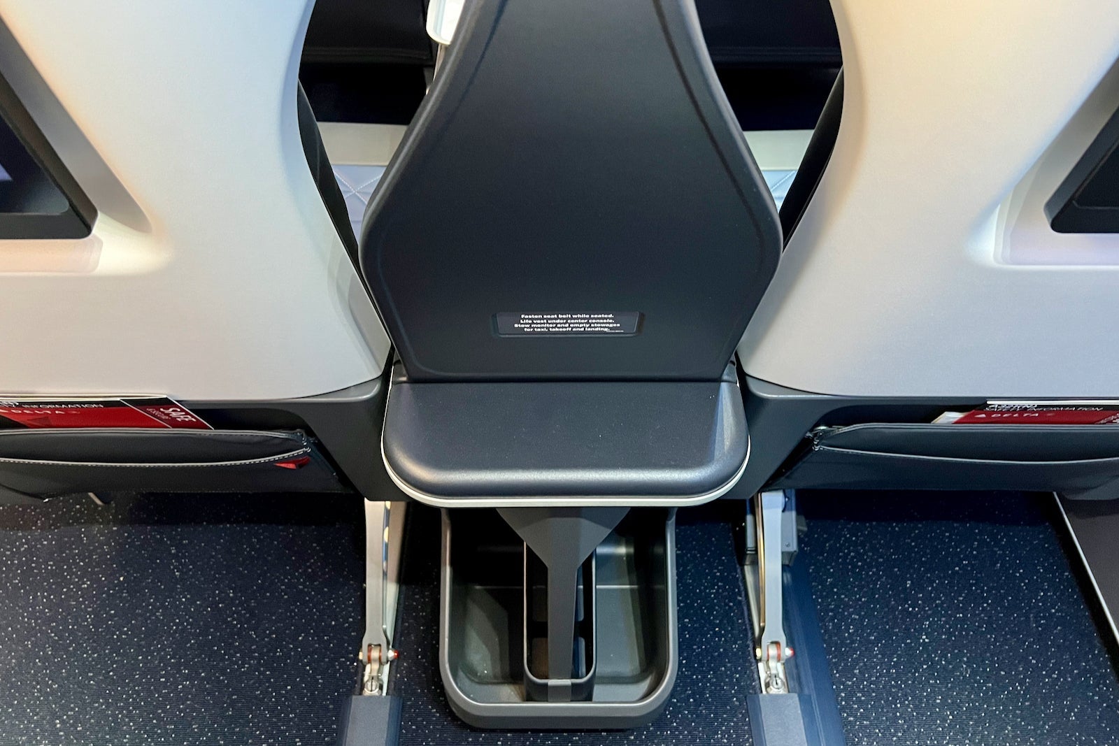 One downside to the new first-class recliner that I found was the tight under-seat storage, especially with the entertainment box and seat-support column that restrict your free space.