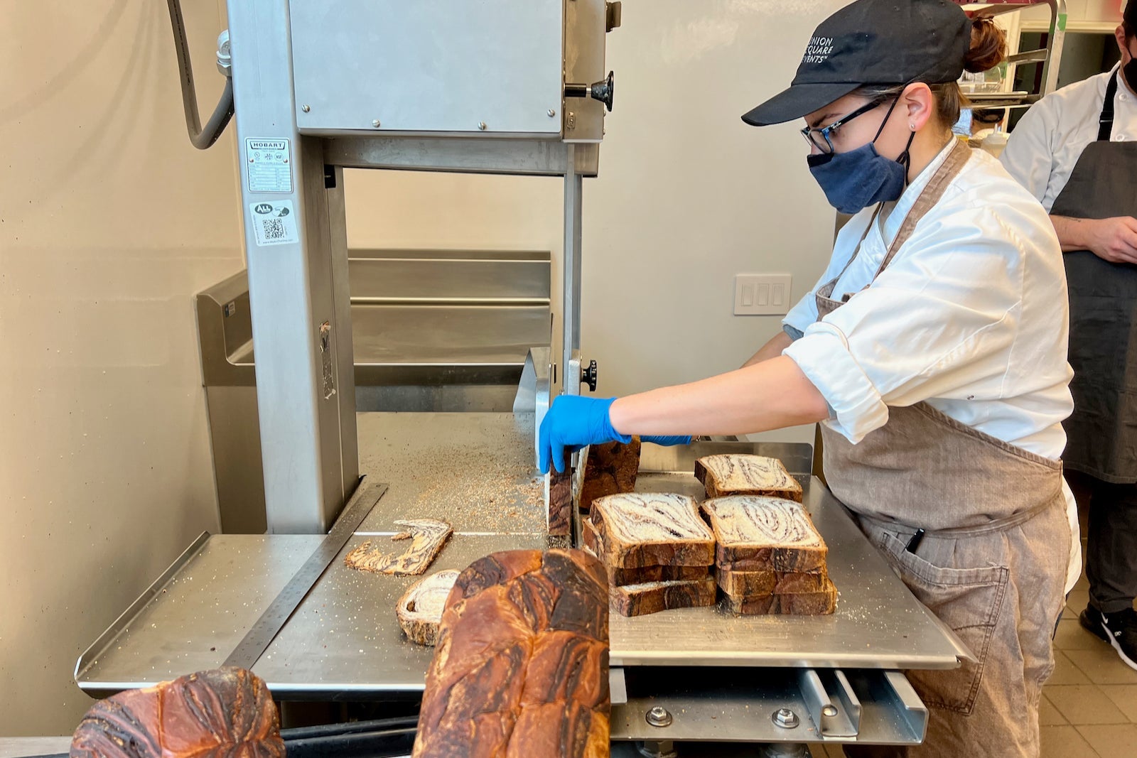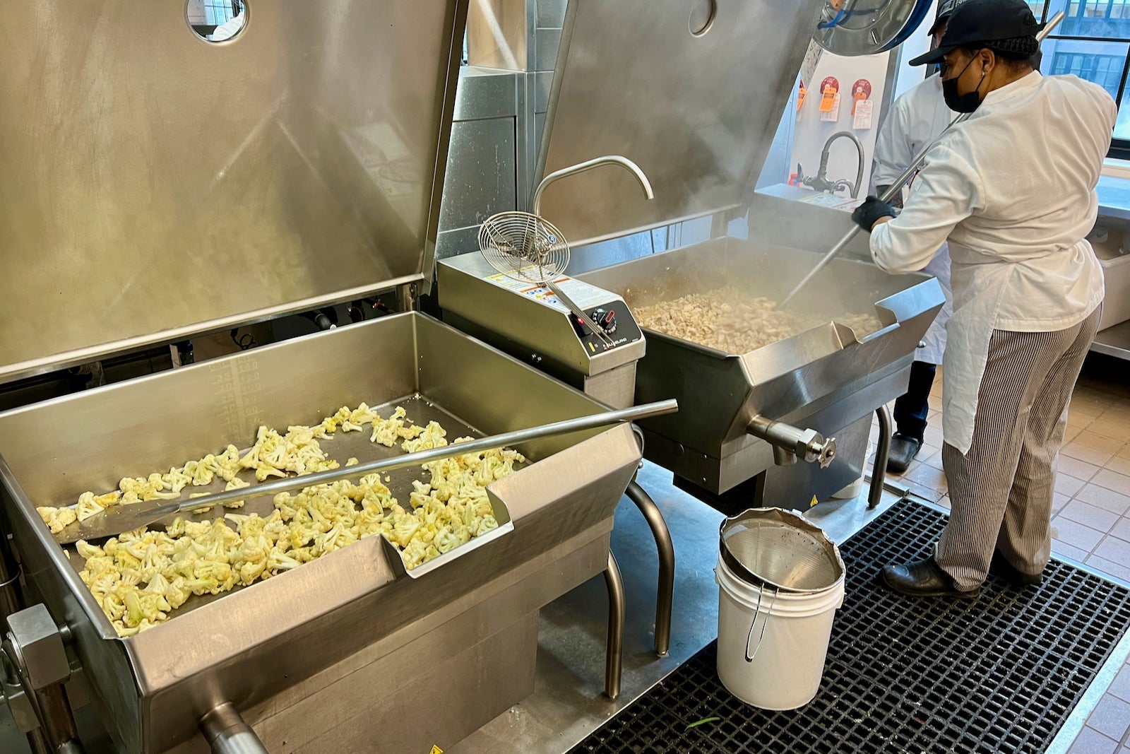 The cooking happens in industrial-size ovens, pots and fryers. The skillet used to prepare the Chocolate babka French toast could easily hold at least 40 pieces at a time.