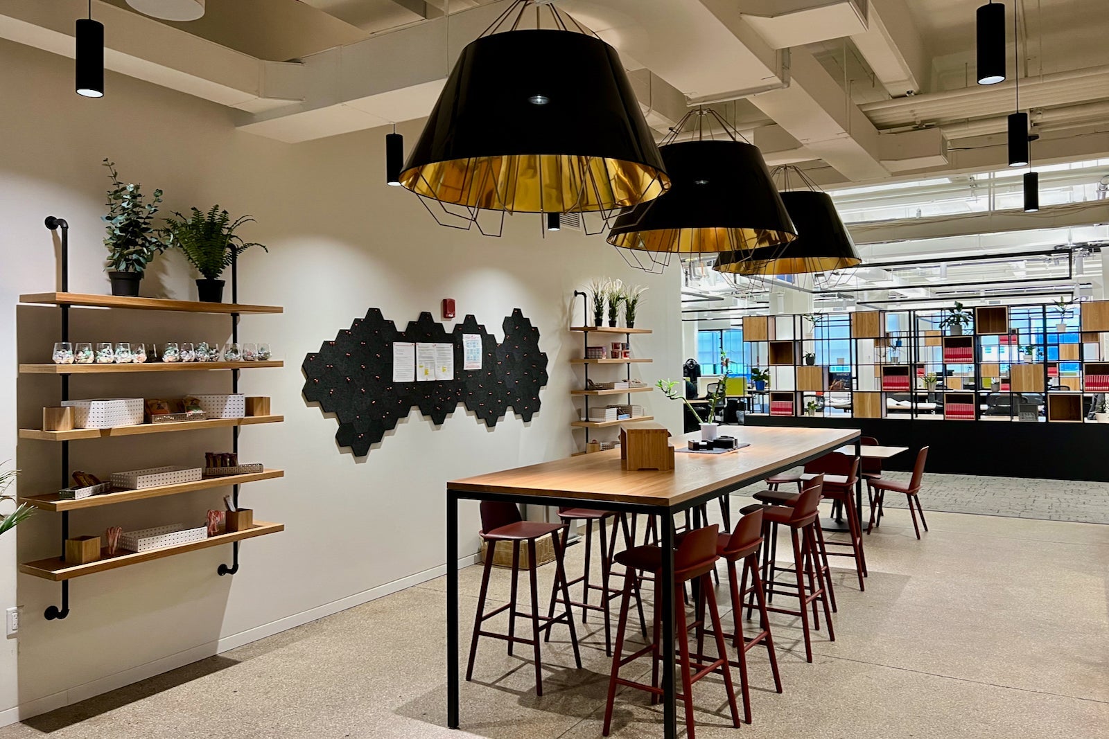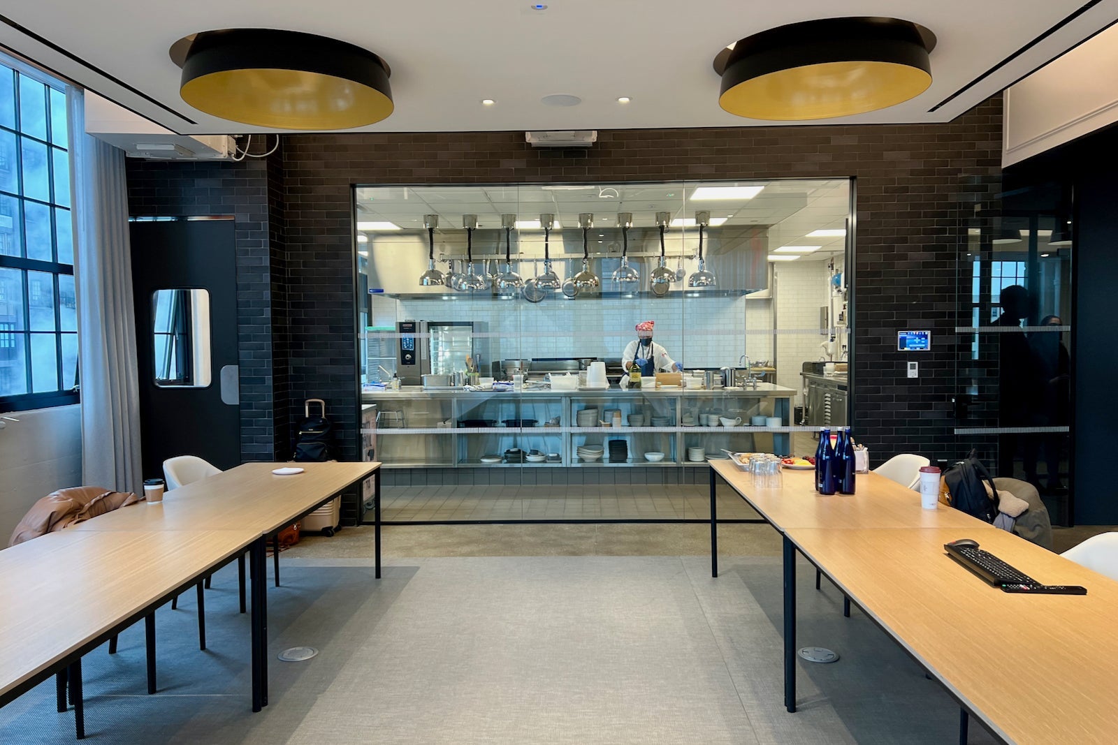 Instead, the conference table was arranged in a horseshoe, giving every meeting participant an unobstructed view of the research and development kitchen located at the front of the room.