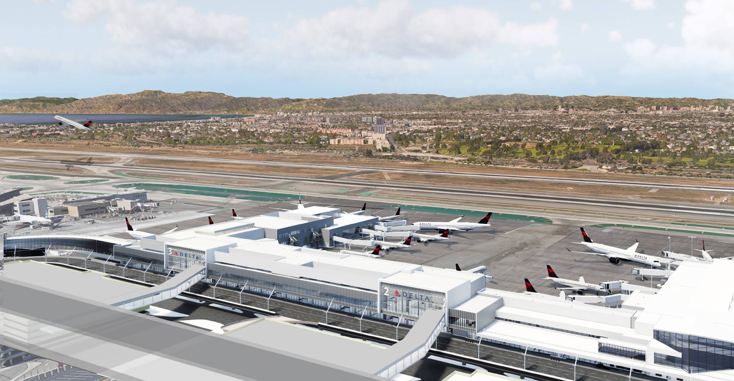 Delta is in the midst of a $1.9 billion rebuild of Terminals 2 and 3 at LAX. The project will create a single unified terminal, dubbed the "Sky Way," with two concourses connected inside security as well as to the adjacent Tom Bradley International Terminal.