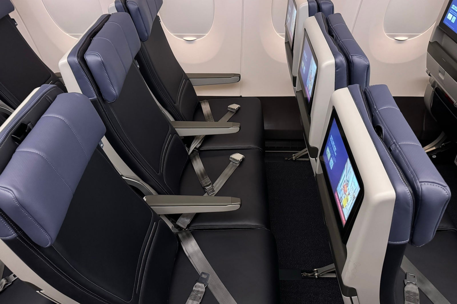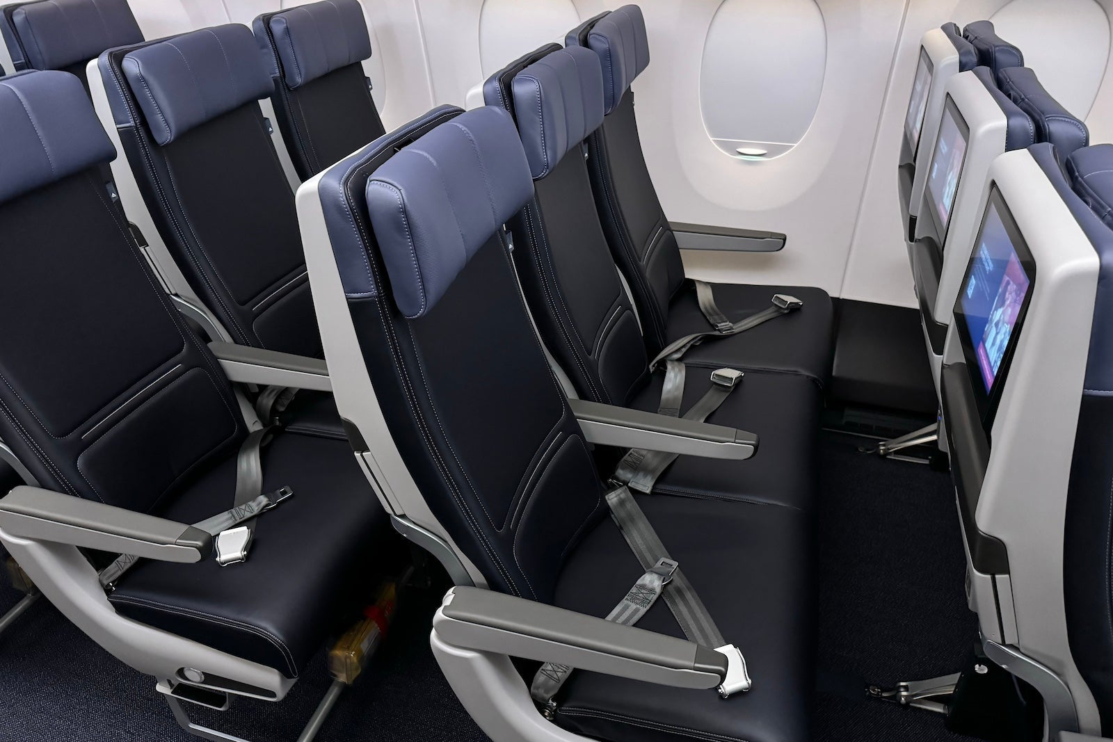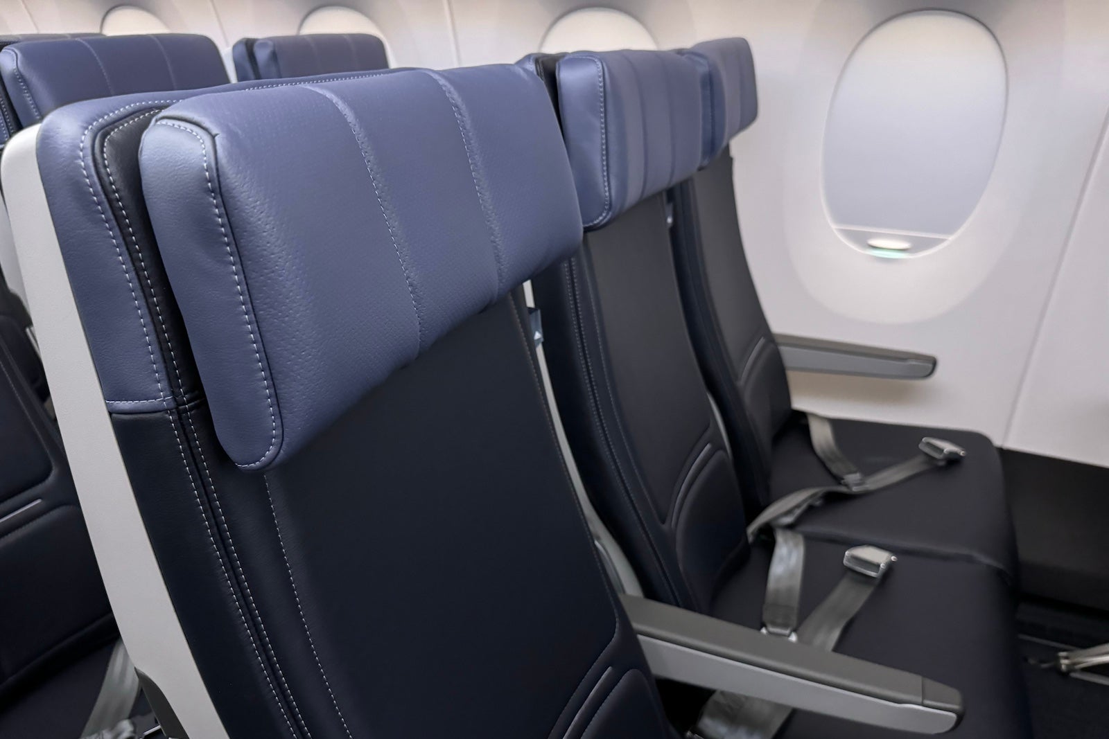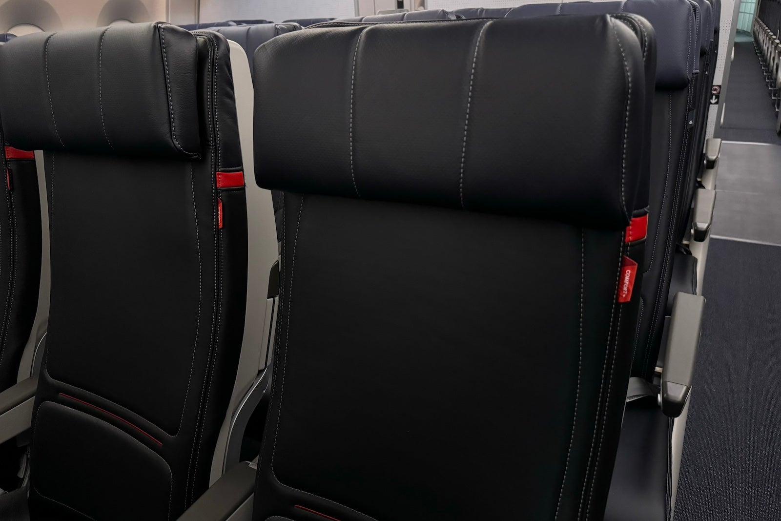 Meanwhile, you can see a slight difference between the Comfort+ seats, which sport a red stripe just beneath the headrest on the side, and the standard economy seats in the rear of the aircraft.