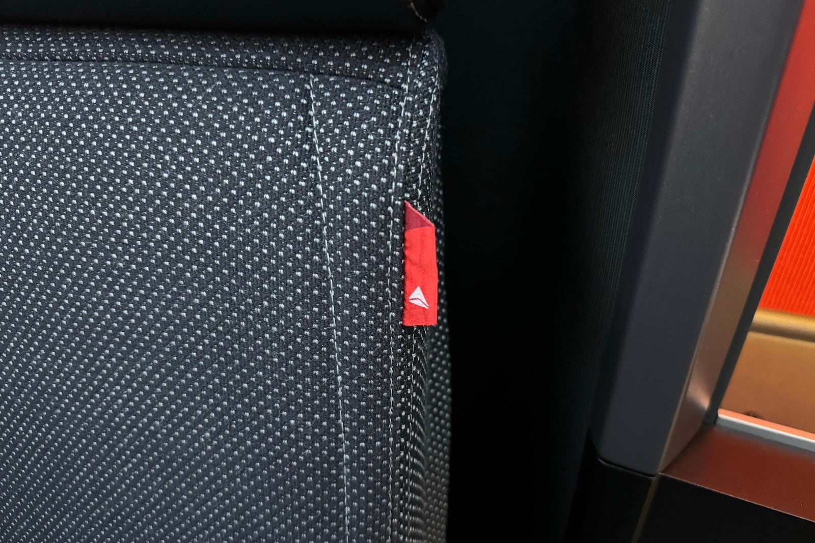 Delta's new seat coverings are a sleeker — if less distinct — dark navy color, featuring small pops of red throughout the cabin.
