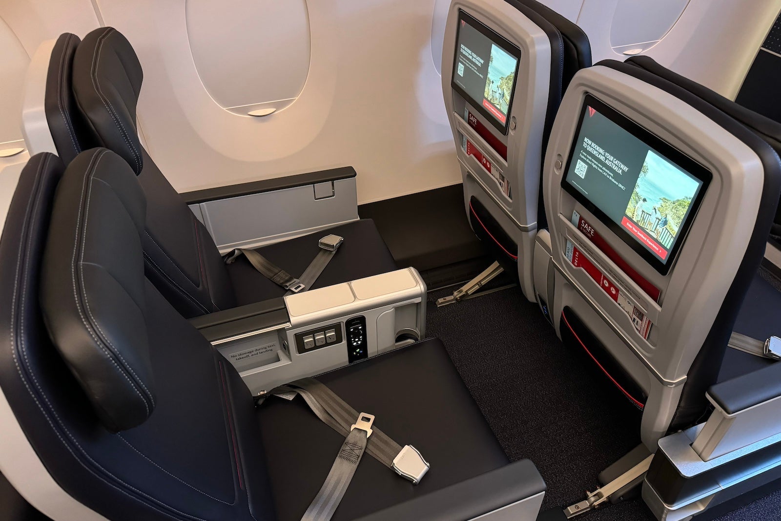 The Premium Select recliners sport a sleek dark leather design with red striping on the seat cushion and the red Delta widget tags on the side. Again, the rest of the "hard product" is what you'll find on existing Delta A350s.