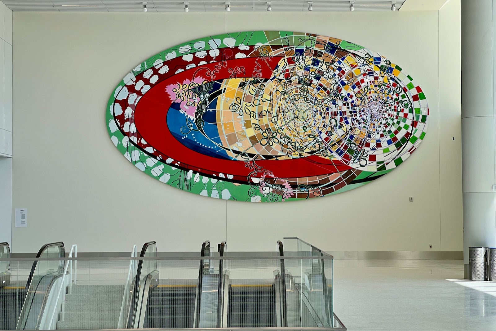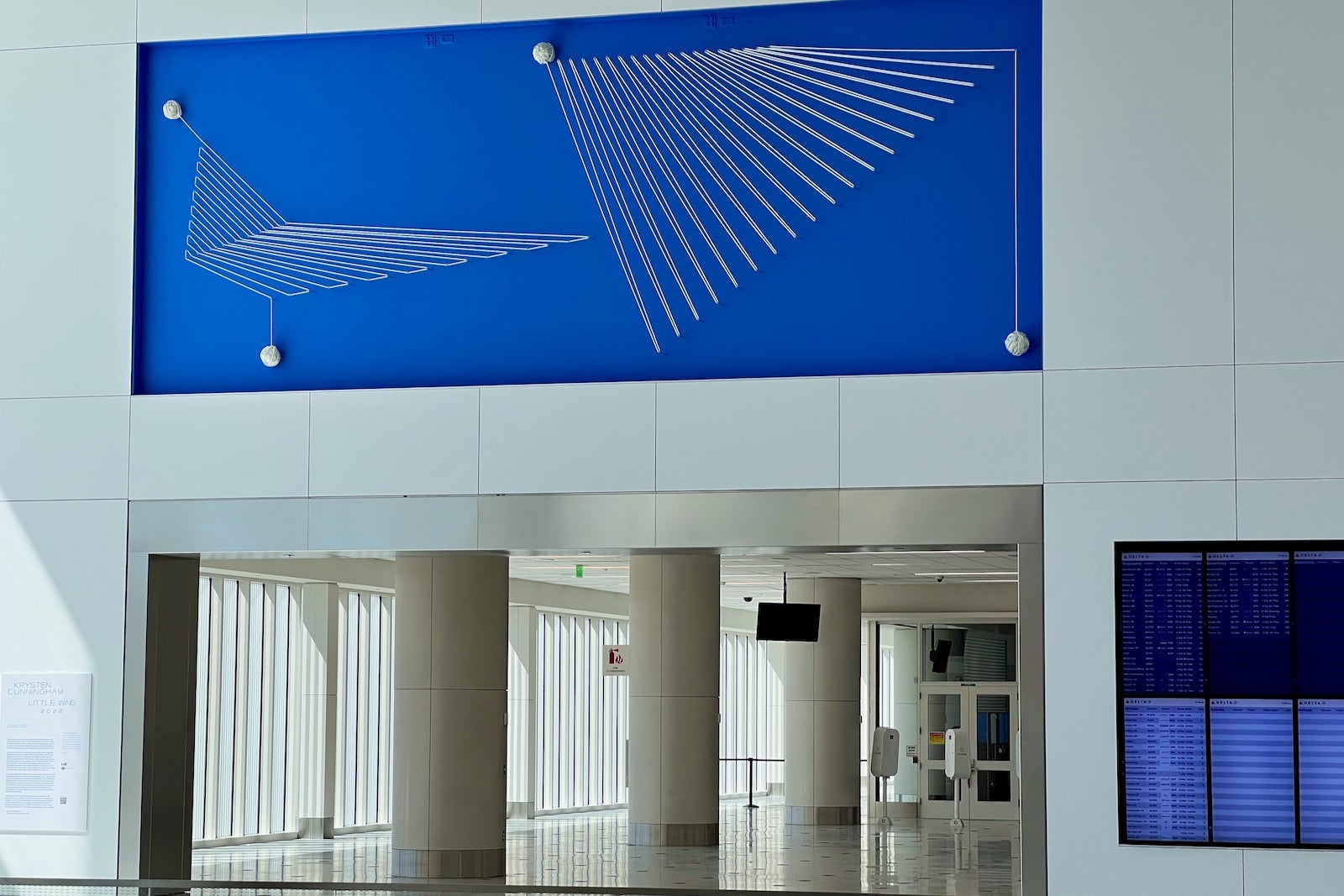 Once upstairs, you'll be greeted by two art pieces, which will help guide your eyes toward the security checkpoint.