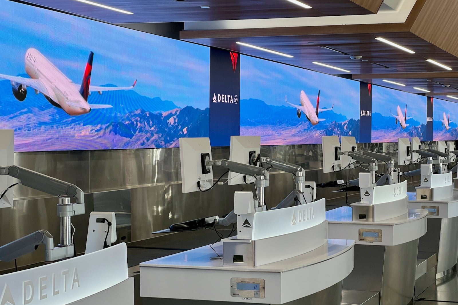 Behind the counters is a 250-foot digital back wall, which spans the entire length of the facility (nearly 20% wider than the wingspan of Delta's largest jet, the Airbus A350).