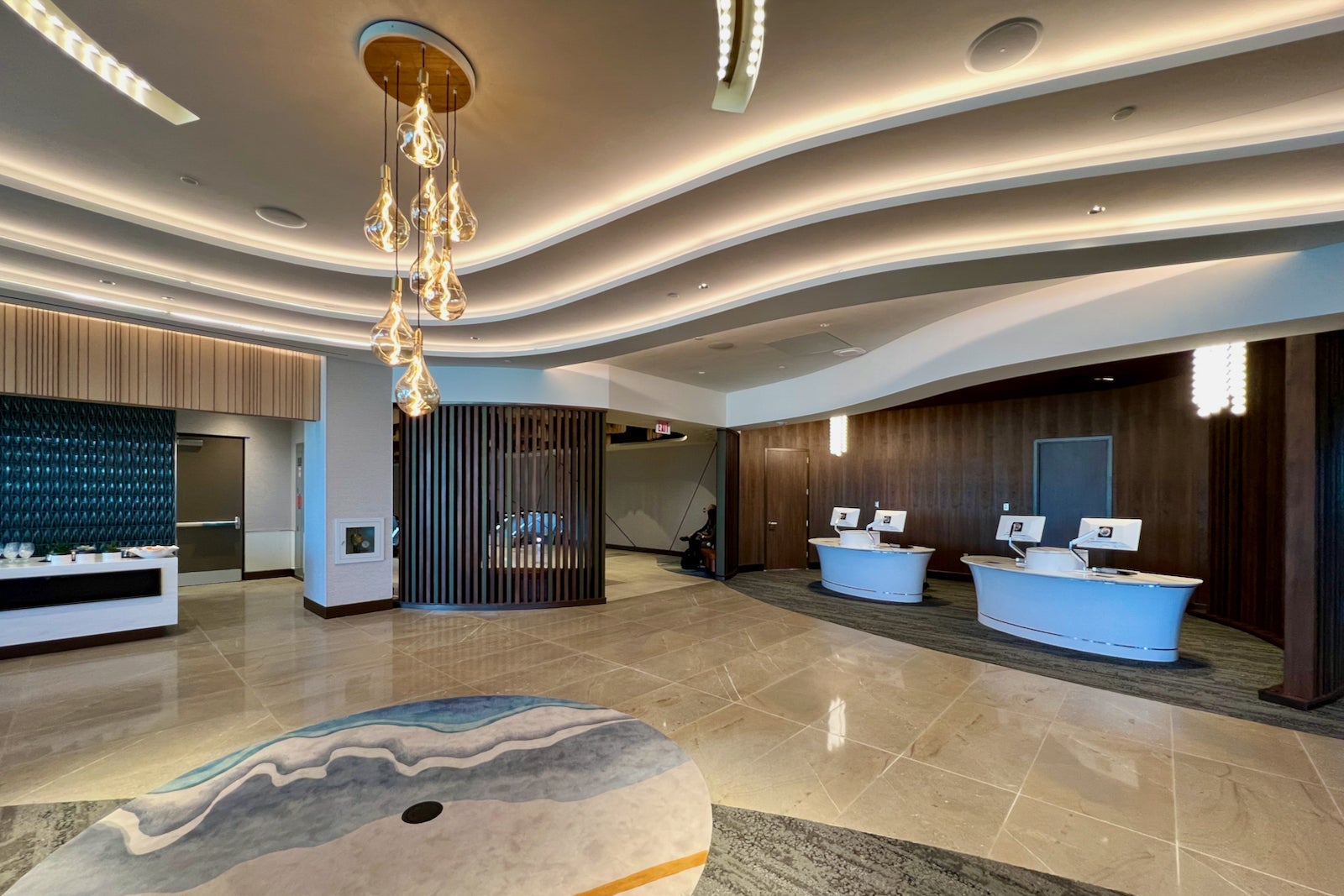 A mix of light and dark wood, patterned carpeting and visually-appealing lighting fixtures combine to give the space a luxurious design.