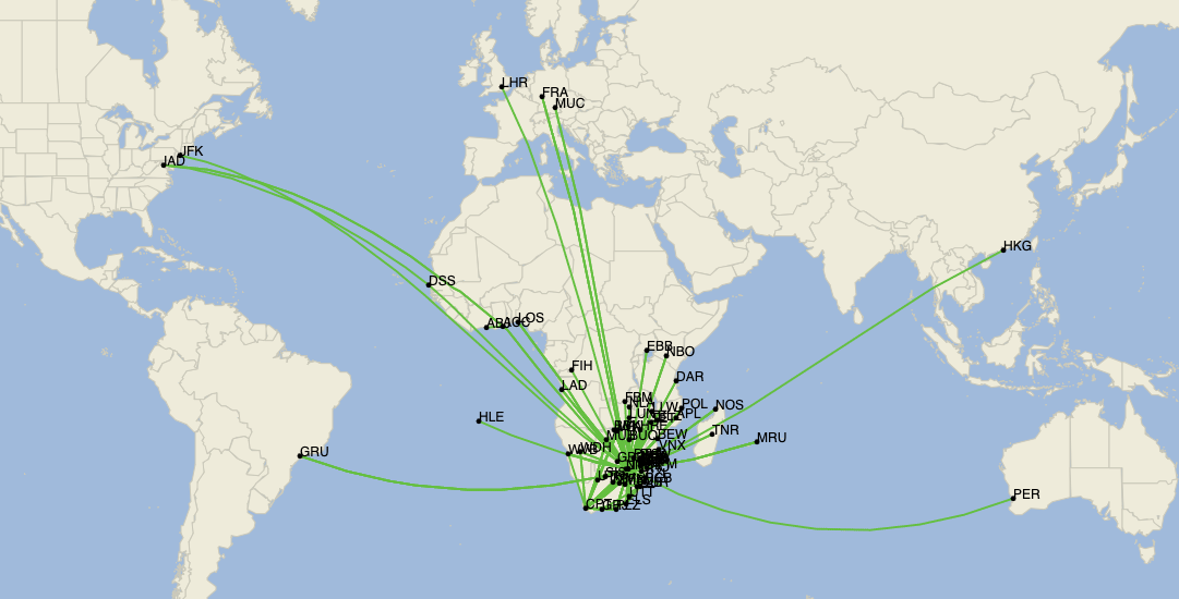 Prior to the COVID-19 pandemic, South African Airways (SAA) was a global carrier with flights from Johannesburg's OR Tambo International Airport (JNB) to New York's John F. Kennedy International Airport (JFK) and Washington Dulles International Airport (IAD). It also flew to South America, Europe, Asia and Australia.
