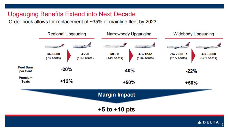 The above slide specifically speaks to upgauging CRJ900 aircraft (76 seats) to A220 aircraft (109 seats), which enables a 12% boost in premium seats across first class and Comfort+ as well as a 20% reduction in fuel burn per seat. The A220 is the most fuel-efficient bird in Delta's fleet, so it's saving cash on gas while selling more seats per flight.