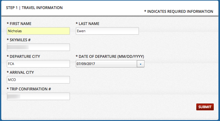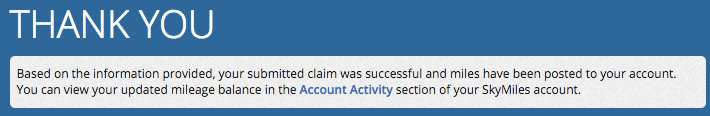 Since my wife had also checked a bag, I went ahead and submitted a second claim with her SkyMiles information and received the same confirmation message. The miles also posted to her account immediately.