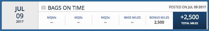 This is an important distinction to note, as a passenger is only entitled to the bonus miles if there is a bag associated with his or her name. In addition, the 2,500 miles are per passenger, not per bag. As a result, if you're traveling with friends or family members, it's best to have each person check his or her bag independently, as each one will have a claim if the bags are late in arriving.