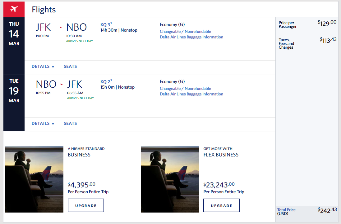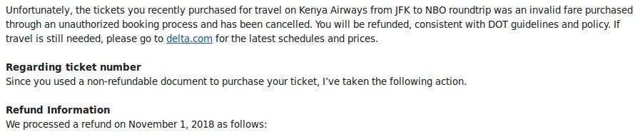TPG reached out to Delta for comment, and spokesperson Morgan Durrant said "a small number of invalid fares between New York and Nairobi ... that included portions operated by codeshare partner Kenya Airways were sold via an unauthorized booking process on delta.com that did not include a required surcharge."