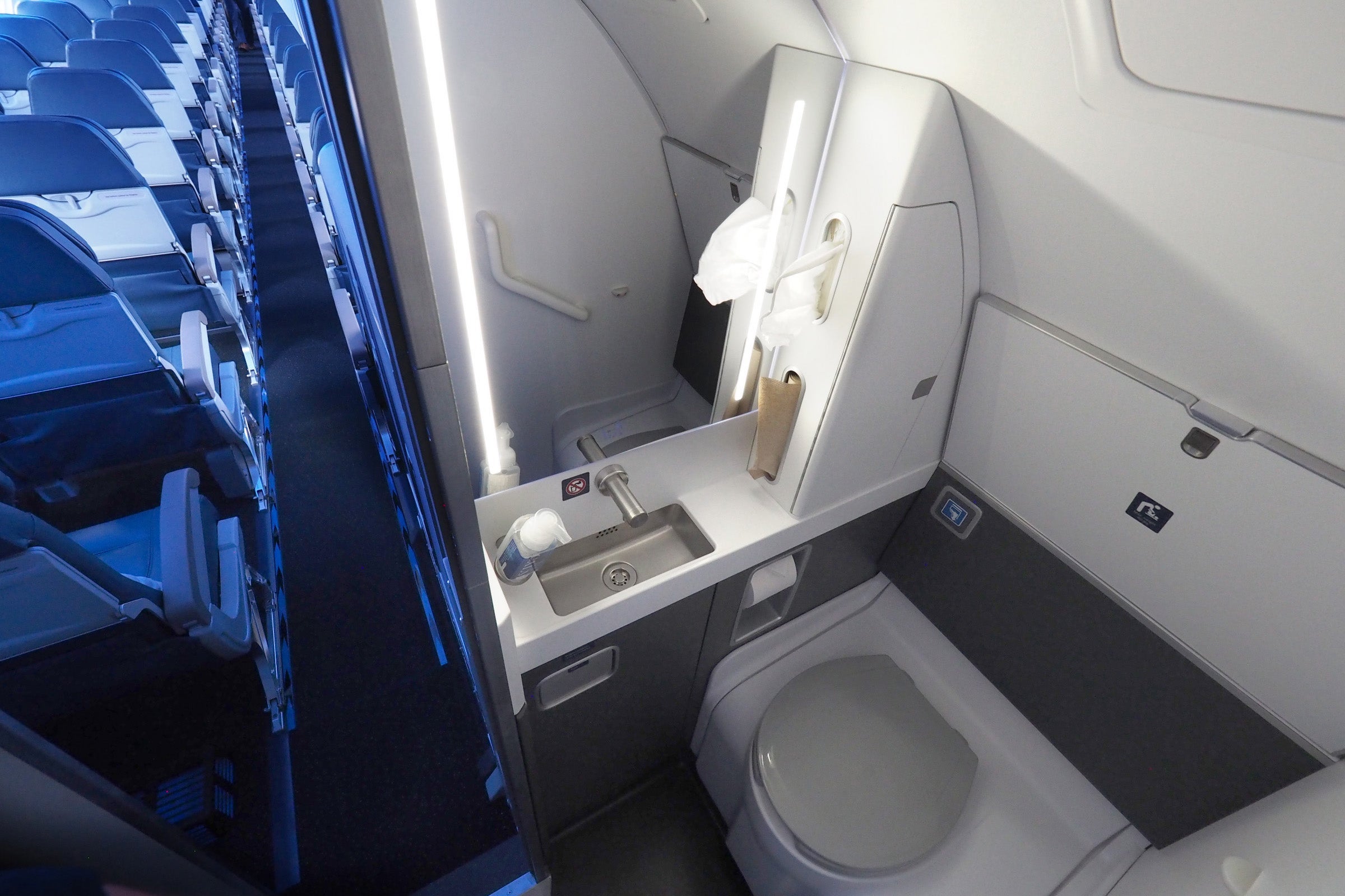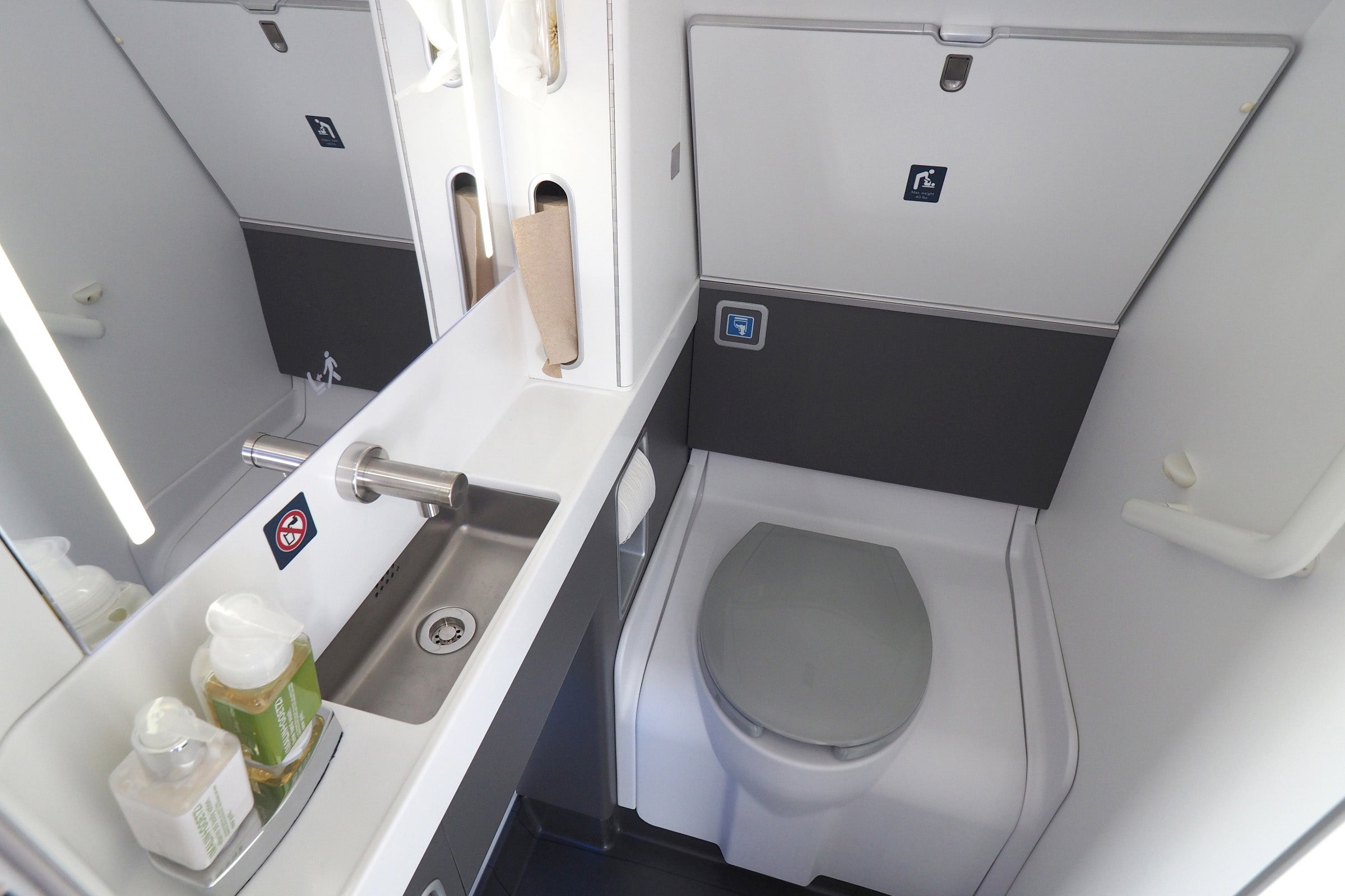 The forward lavatory has up to 90% more space, with up to three more inches of headroom. It's also large enough to accommodate wheelchair passengers.