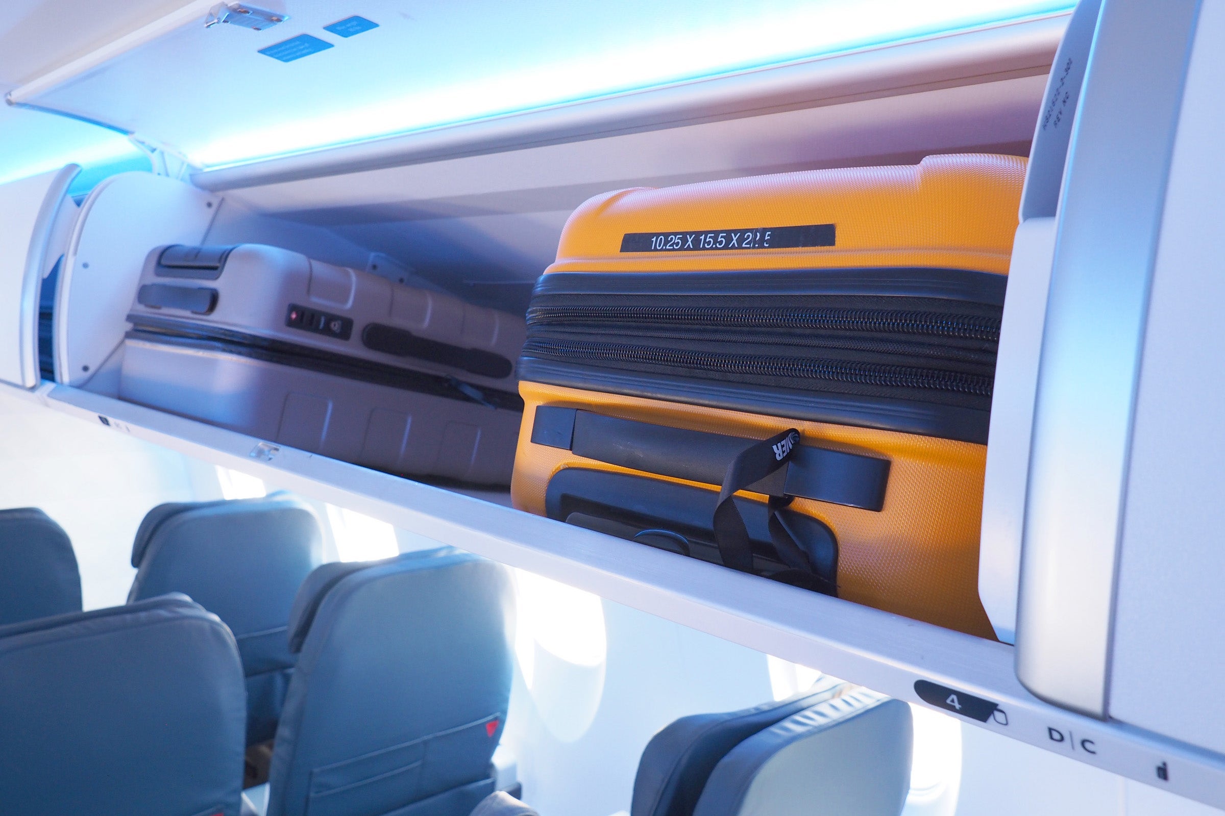 The first-class overhead bins have gotten a significant upgrade — there's 50% more space, making it possible to store more bags in a wheels-first arrangement. Economy bins have been enlarged by 40% as well, but they aren't quite as big as those up in first.