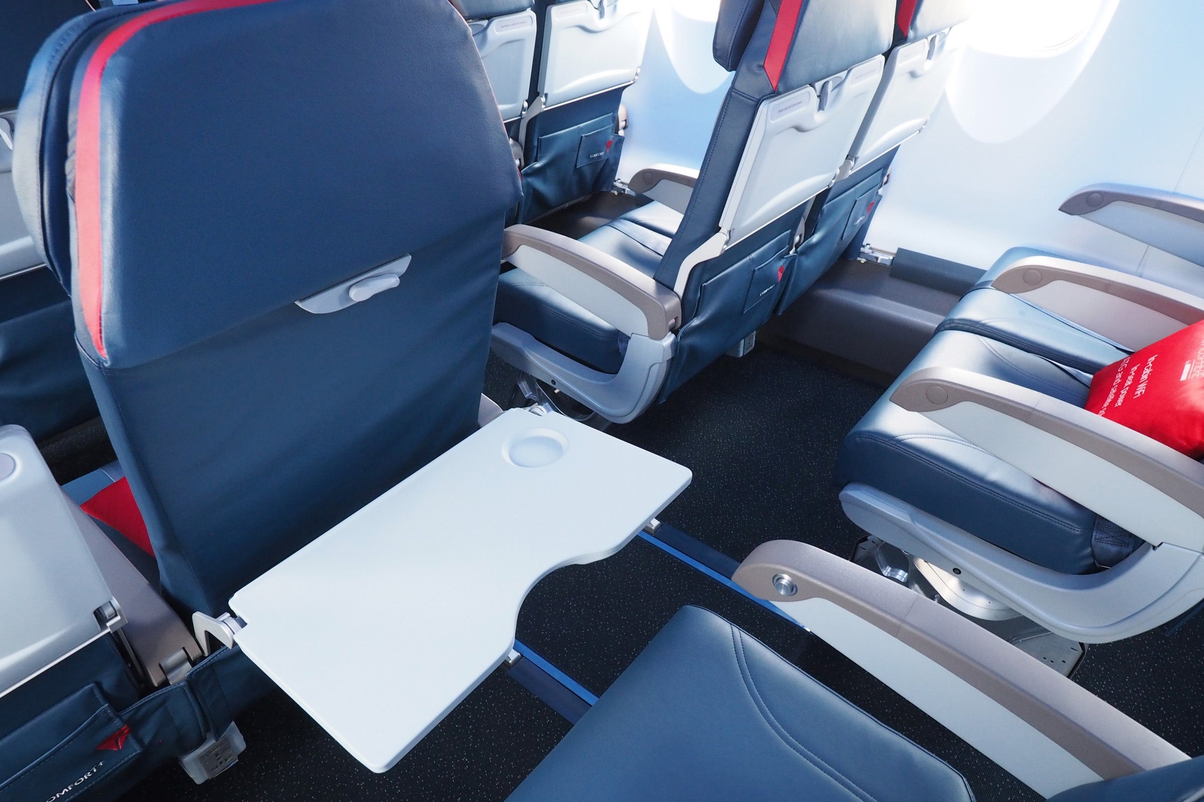 All seats have a pop-out or fold-down tray table that's big enough to support your laptop — or an in-flight drink and meal.