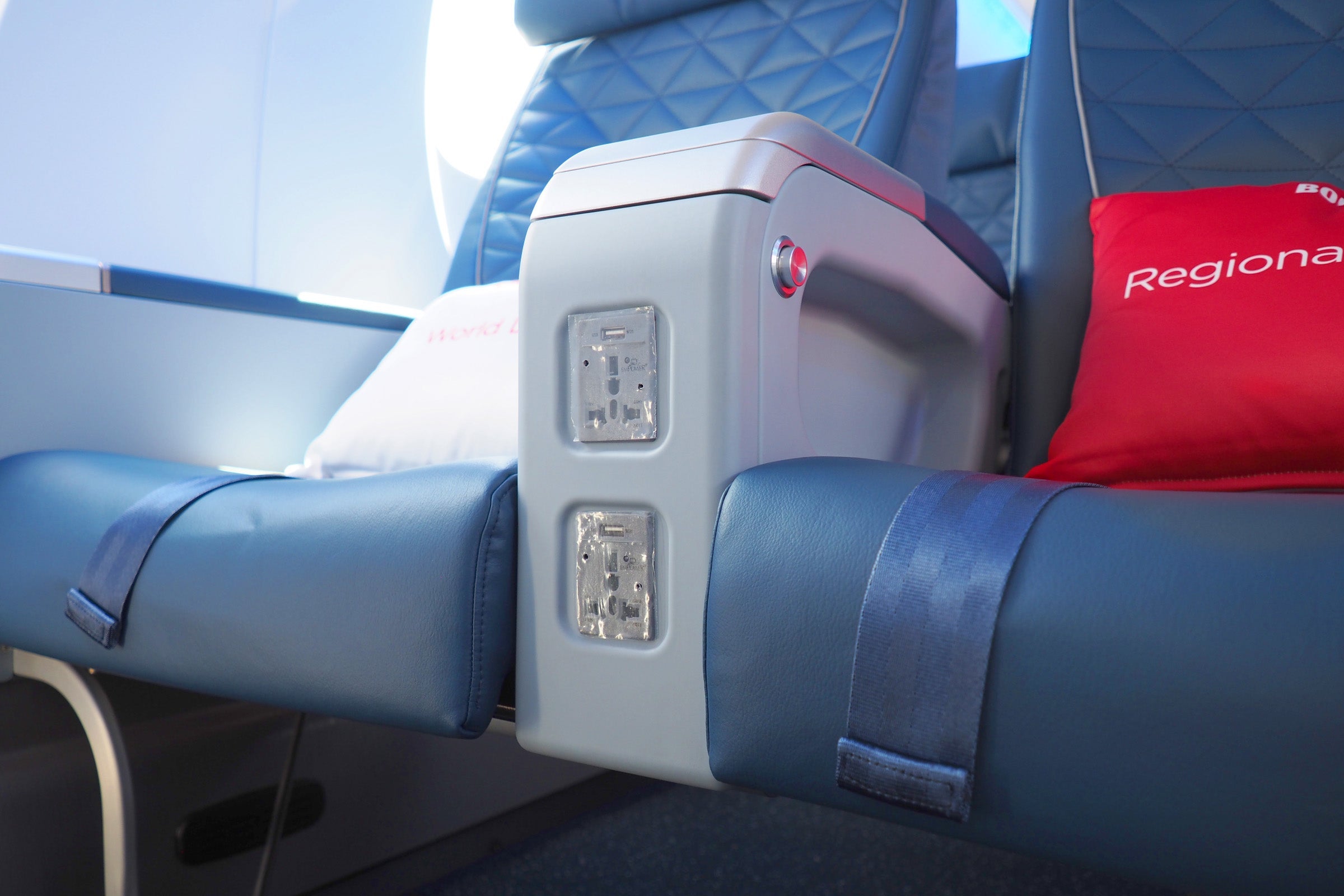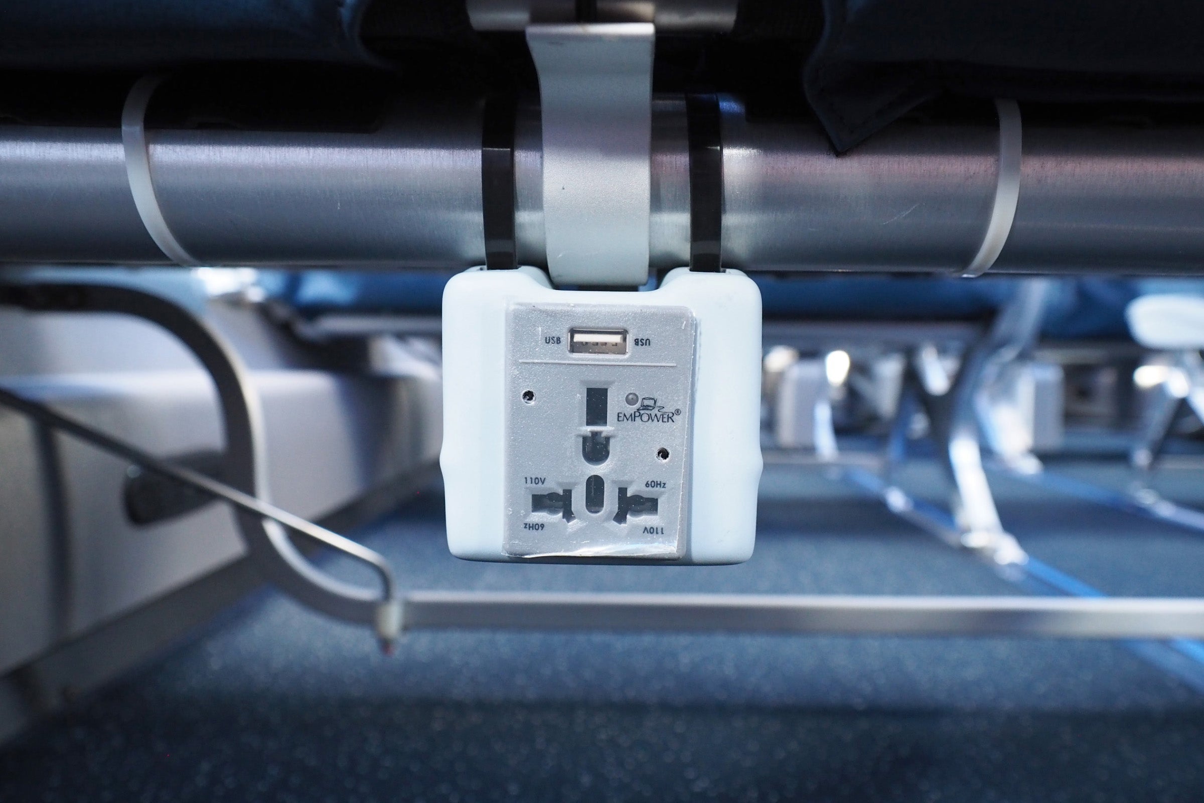 Every row on the plane offers in-seat power now — even in coach. Economy and Comfort+ passengers need to share their outlets, though, with one universal outlet and one USB port for each pair of seats.