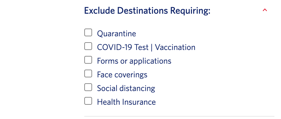 Similarly, you can exclude destinations with certain requirements such as the need to quarantine or be vaccinated to be allowed entry.