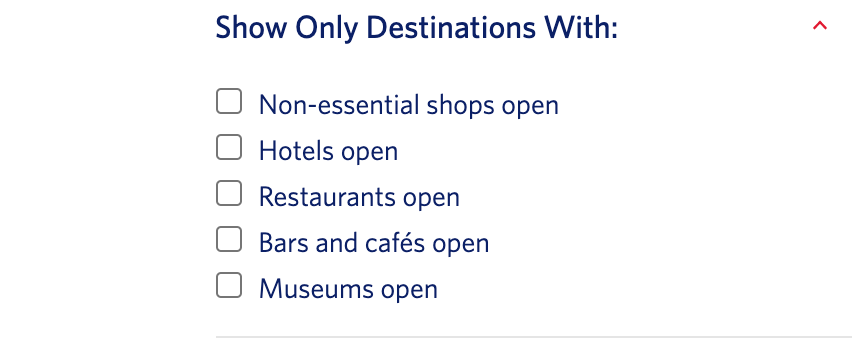 One of the unique elements of Delta's map is that you can actually filter down to some of the more minute parts of a destination's reopening. For instance, if you don't care where to go, but you want all restaurants and museums to be open, you can search for that.