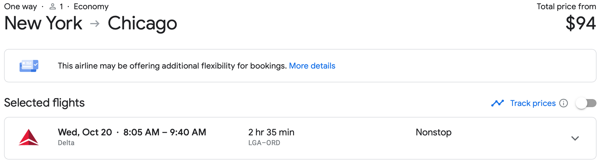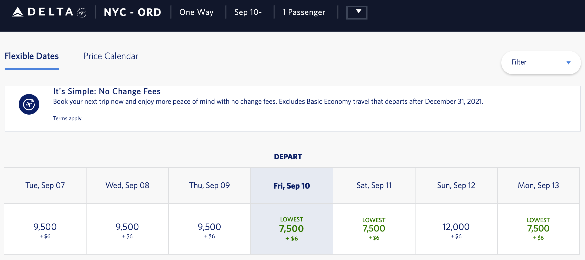 Luckily for me, Delta often offers the best redemptions on this route when booking at the last minute. At the time of writing this article, I can book a one-way ticket from New York (LGA) to Chicago-O'Hare (ORD) for as few as 7,500 SkyMiles just seven days in advance. Plus, prices rise moderately to 9,500 SkyMiles even closer to the departure date.