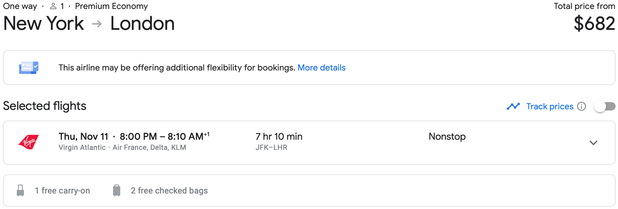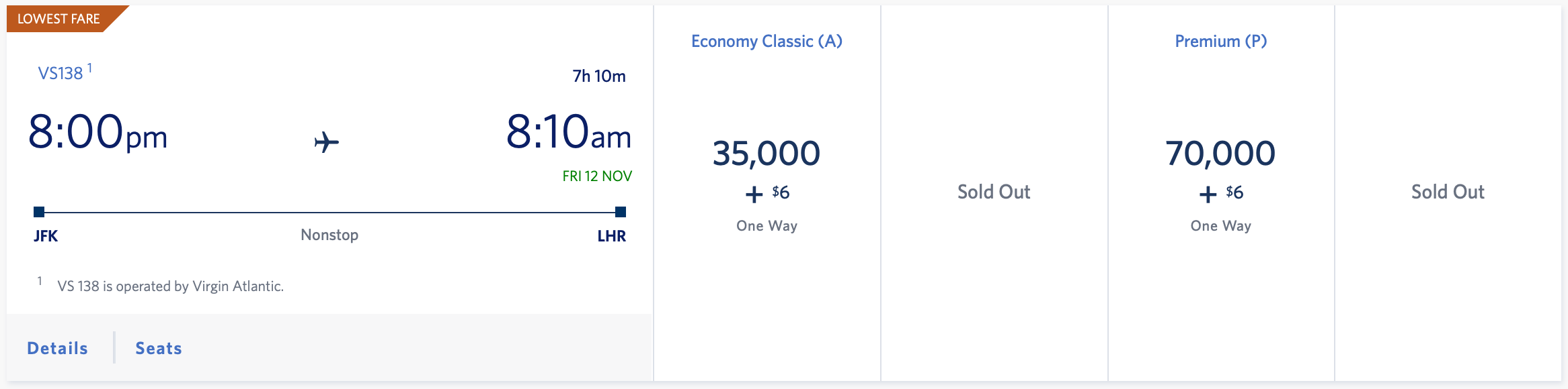 Given these high award rates, you don't generally get a great value for your SkyMiles on these flights. A one-way Virgin Atlantic ticket from New York-JFK to London-Heathrow (LHR) booked nearly three months in advance costs 35,000 SkyMiles in economy or 70,000 in premium economy. Both awards charge $5.60 in taxes and fees.
