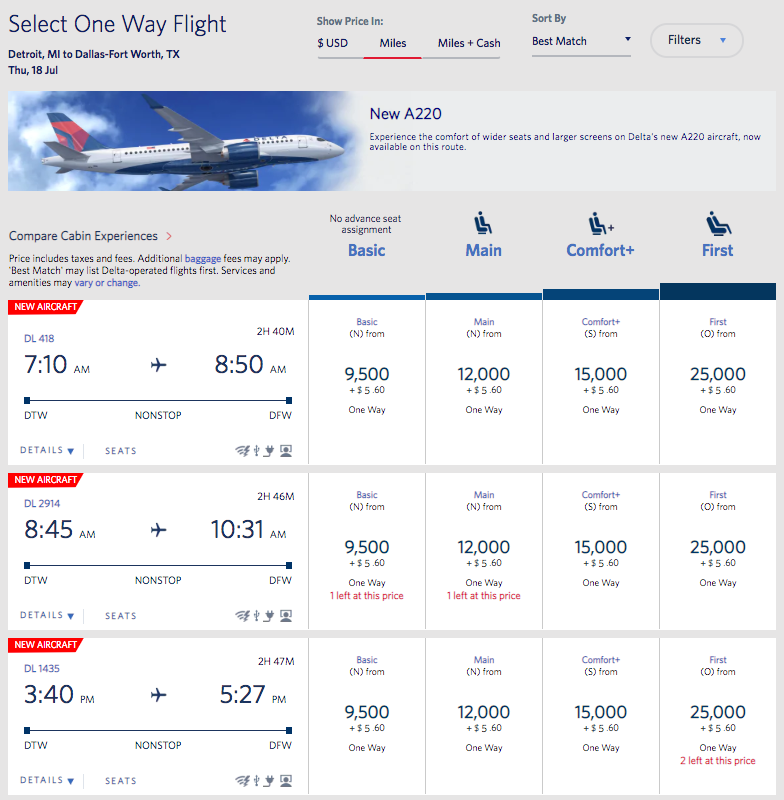 That's the bad news: There appears to be no stopping the subtle creep of BE fares, even on the award side. The good news is that it does appear some fares are lower than we've ever seen, such as the ability to fly from Detroit (DTW) to Dallas–Fort Worth (DFW) on Delta's brand new A220 for 9,500 SkyMiles each way.