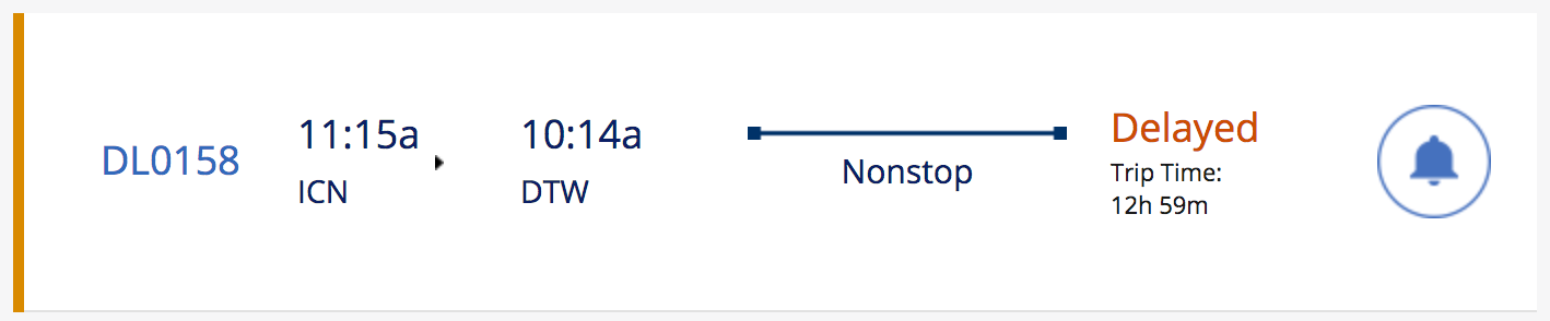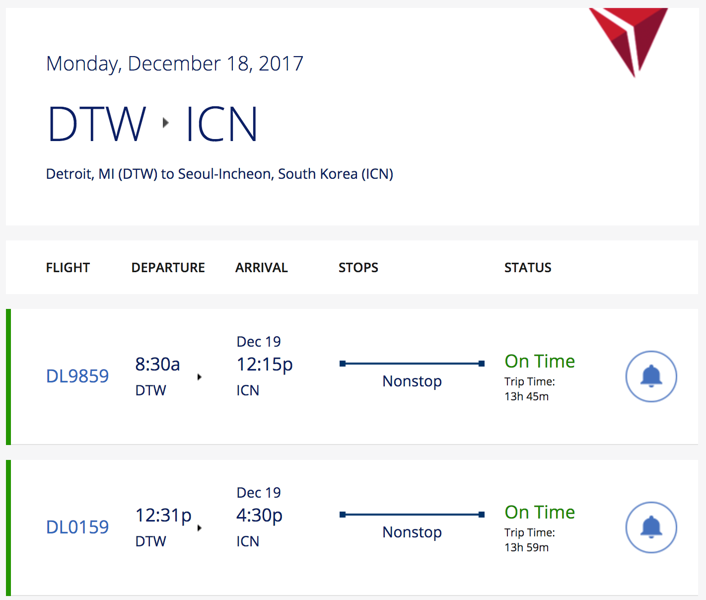 - December 17: Delta Flight 159 departing Detroit (DTW) at 12:31pm and arriving Seoul (ICN) at 4:30pm on December 18