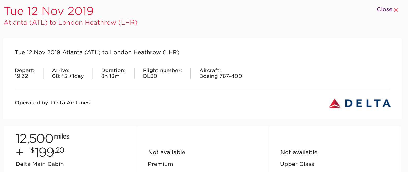Unfortunately, our go-to trick of using Virgin Atlantic to grab Delta seats for less shows no availability outside of economy. That said, if you're looking to ride in the back, 12,500 Virgin Atlantic Flying Club miles sure beats the 39,000 SkyMiles Delta wants for the same seat.