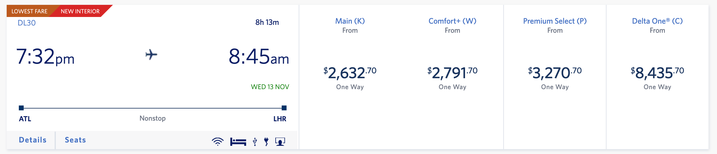 Hitching a ride on the first flight between Atlanta and London isn't cheap. Claiming a new Delta One seat with cash will set you back over $8,000, though we expect that to fall a bit between now and departure.