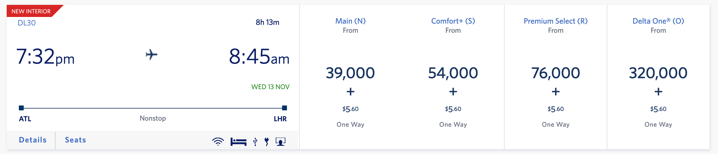 It's really no better with SkyMiles. 320,000 of them for a one-way trip is borderline offensive, though prices are more reasonable for Main Cabin, Comfort+ and Premium Select. If your dates are flexible, you can keep an eye out for flash sales posted on TPG's Deals page.