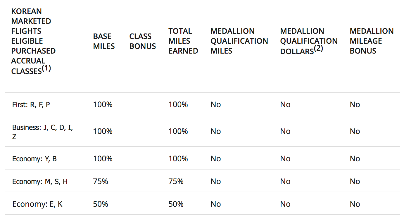 In the current SkyMiles chart, Korean is listed as a Group 4 partner (along with Alaska Airlines, Great Lakes Airlines, Hawaiian Airlines and WestJet) which means that SkyMiles members can't earn Medallion Qualification Miles (MQMs) or Medallion Qualification Dollars (MQDs) on Korean flights, regardless of class of service. It's likely, however, that we could see Korean's classification for earning on Delta's chart change very soon.