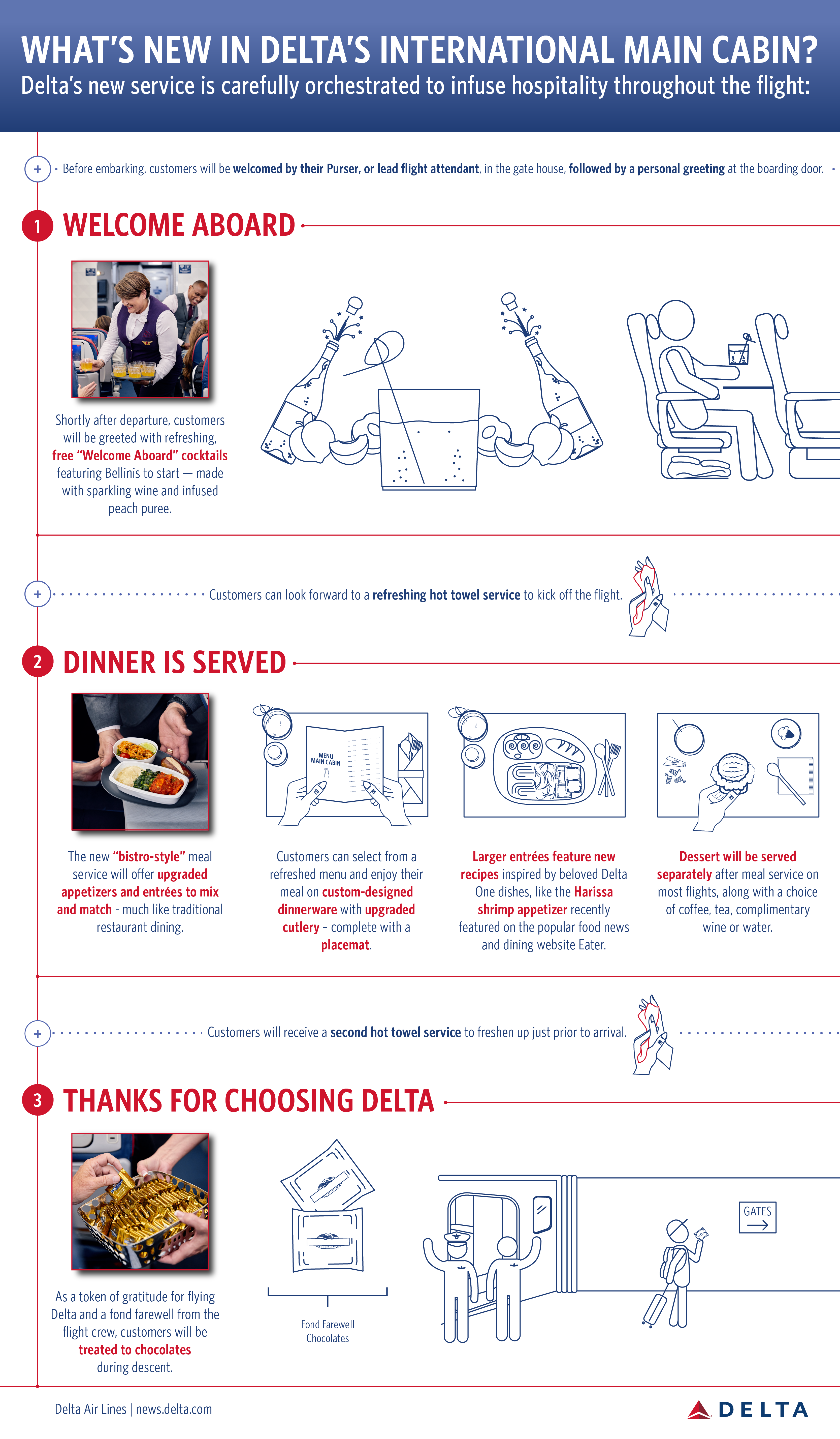 Shortly after takeoff, coach passengers on qualifying flights will be treated to a complimentary Bellini and hot towel. The improvements continue through the meal service, with more variable meal choices and larger portions. Even the plating will be improved, with less plastic wrap and better cutlery.