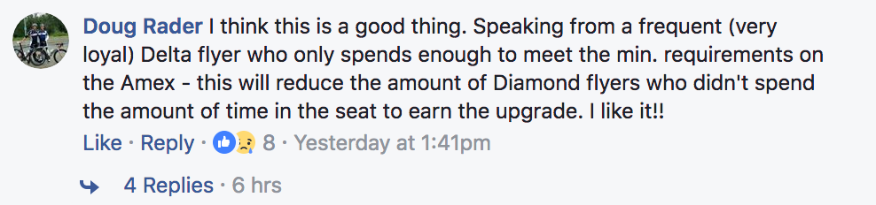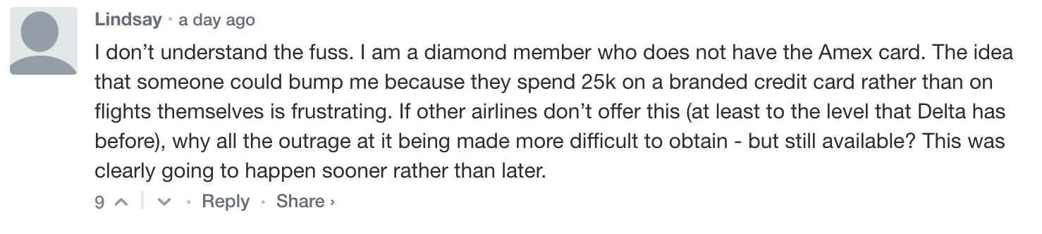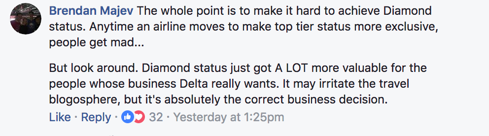 Many TPG readers echoed Richard's sentiment, both in the comments section on yesterday's post and on Facebook. Take a look at what some Delta flyers (mostly Diamond Medallion members) had to say, below. One reader pointed out that Diamond is Delta's most exclusive level of status, and should be treated as such.