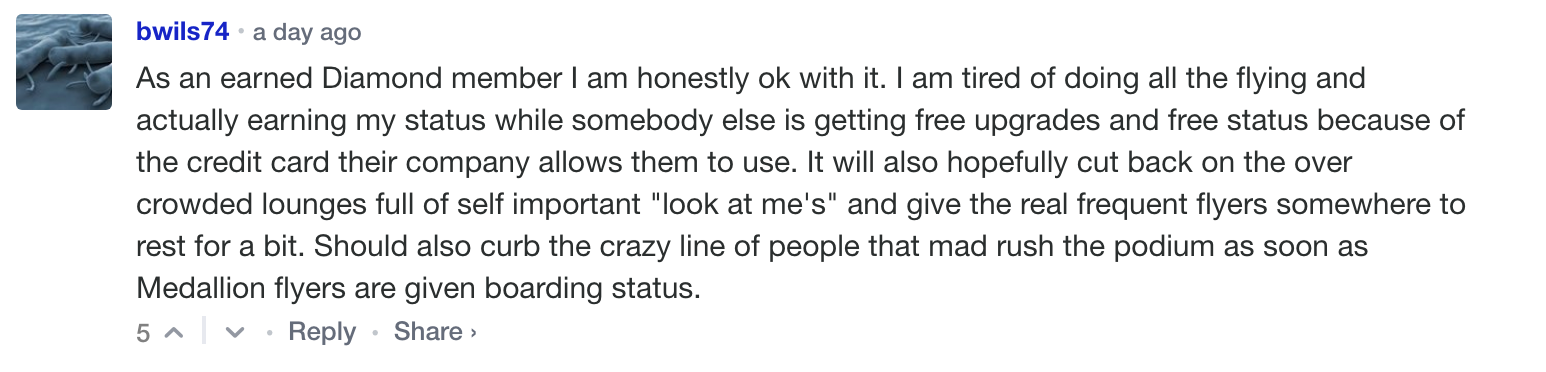 Another reader is happy that the ranks of the Diamond members will be reduced, which could perhaps lead to lesser crowds at the gate when Diamond and other Medallion members are called to board.