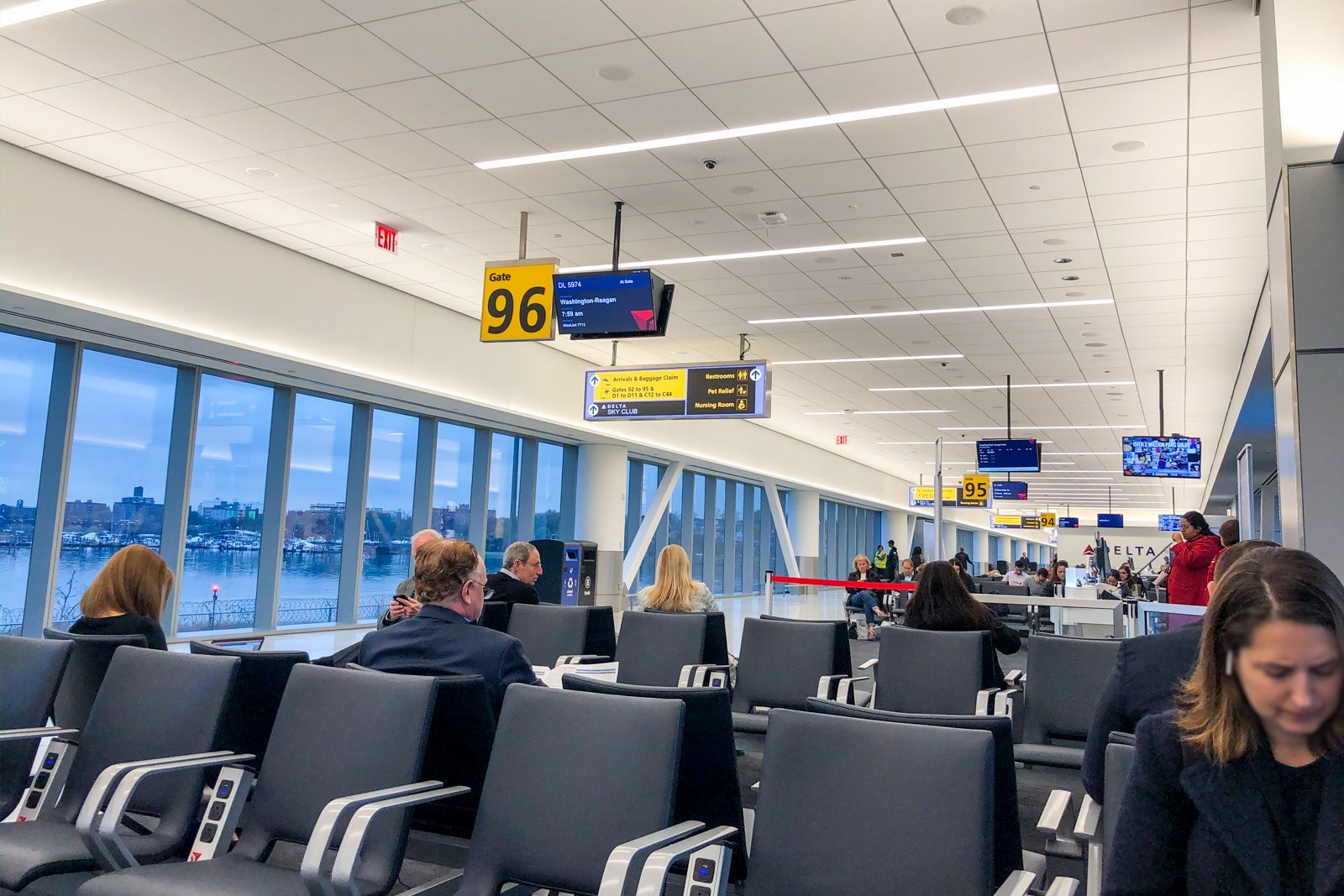 In many ways, Delta's new concourse feels like a new, much smaller airport in some other city. It's on the very edge of LaGuardia's property, so close to the water it can seem like the East River is lapping up against the windows from the right vantage point. And since it primarily serves Delta Shuttle flights, the gates are mostly occupied by regional jets. Still, there were a few mainline services on Tuesday morning: a flight to Birmingham, Alabama, and a delayed flight to Jacksonville, Florida. (Even a new building can't help late-arriving aircraft.)