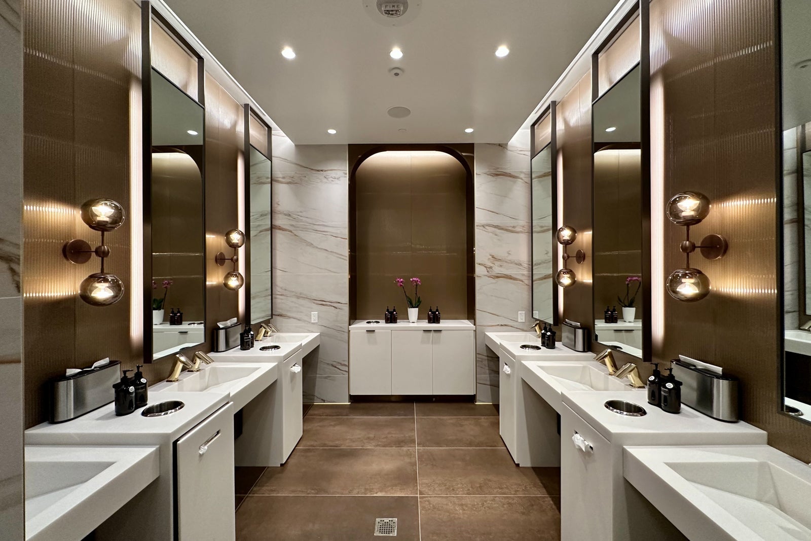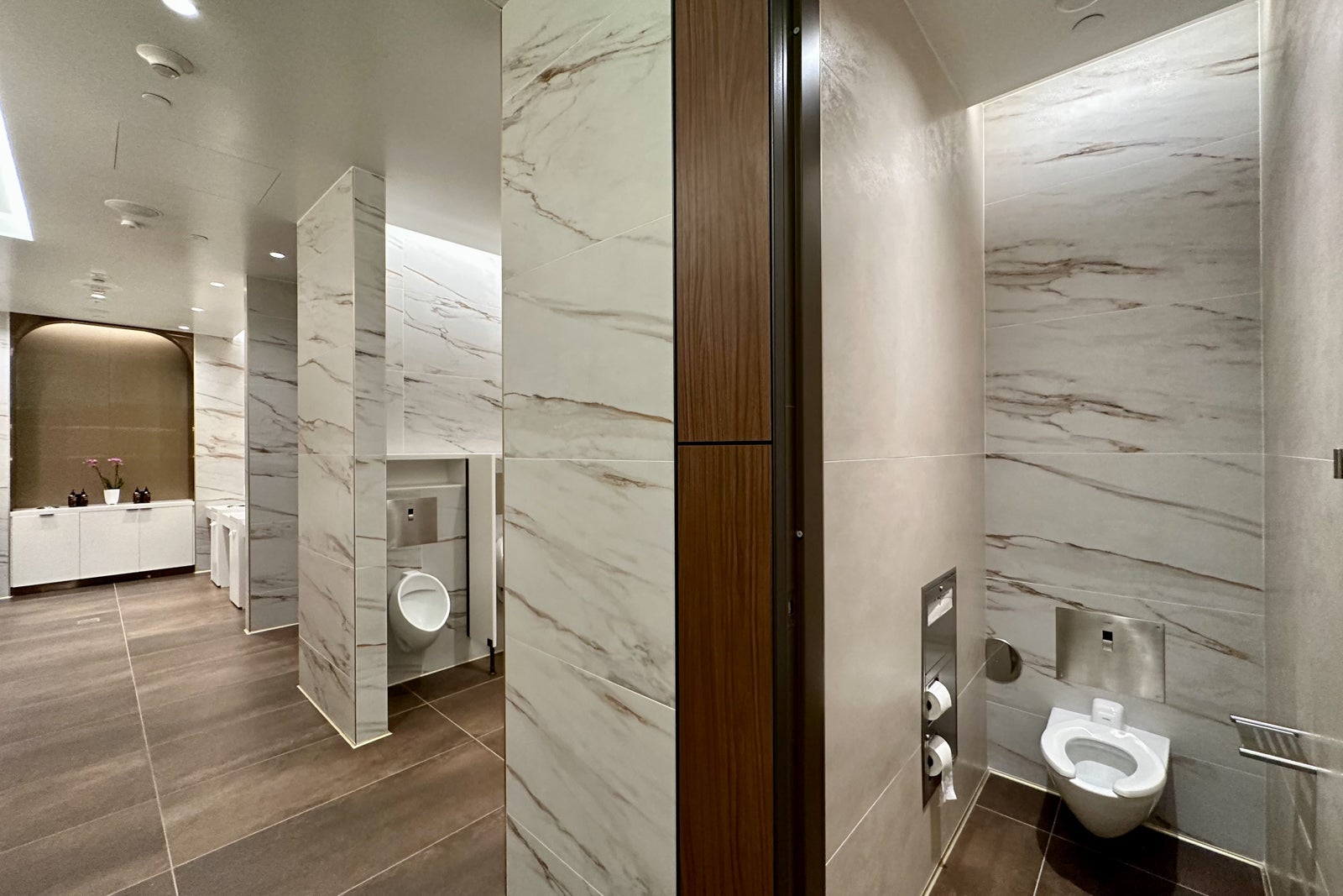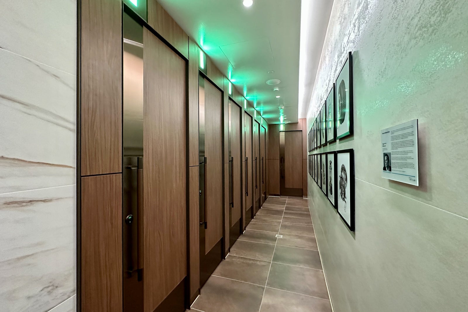 With specially curated artwork, marble sinks, fancy sconces and red/green occupancy indicators above the stalls, these restrooms are some of the nicest in the entire airport.