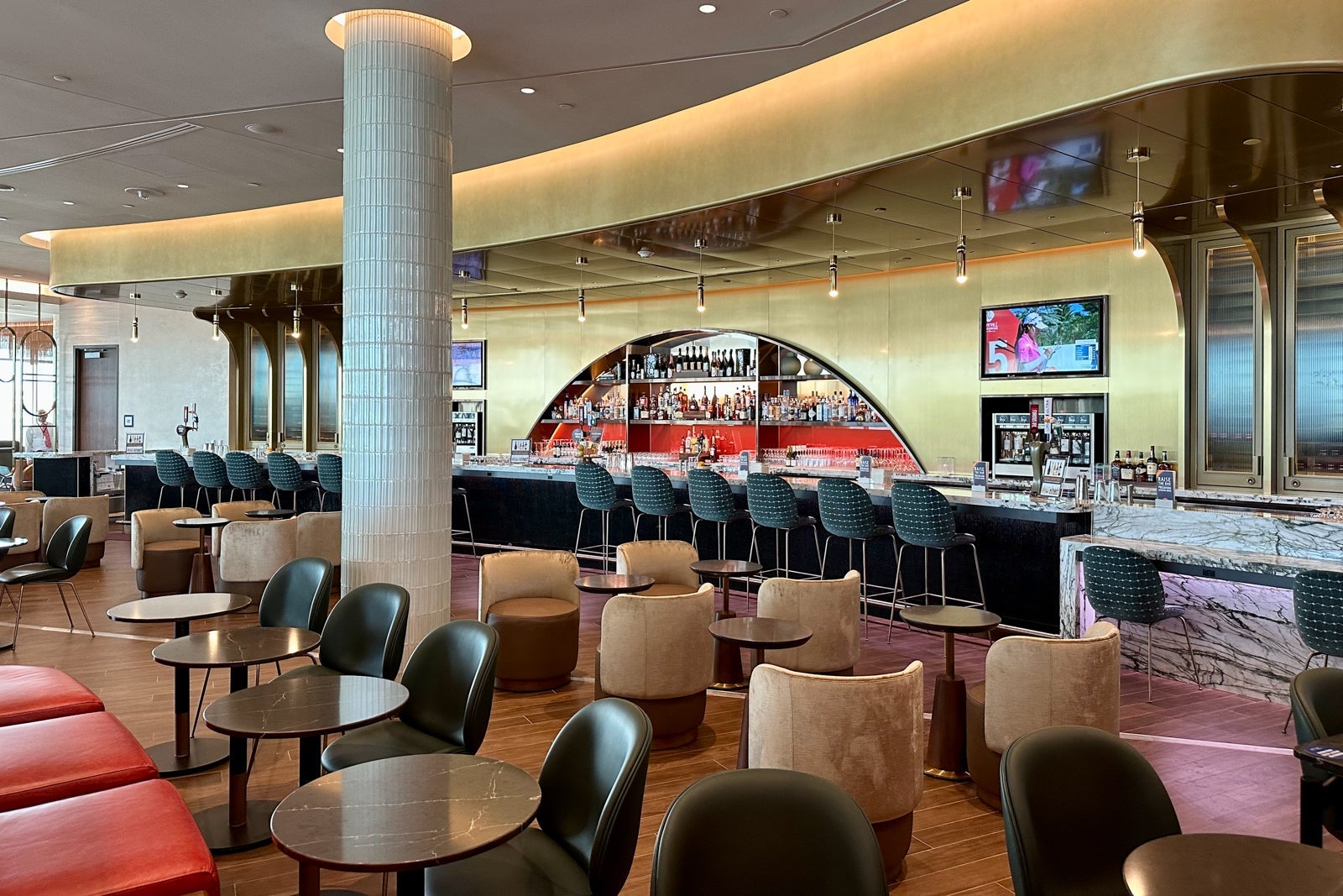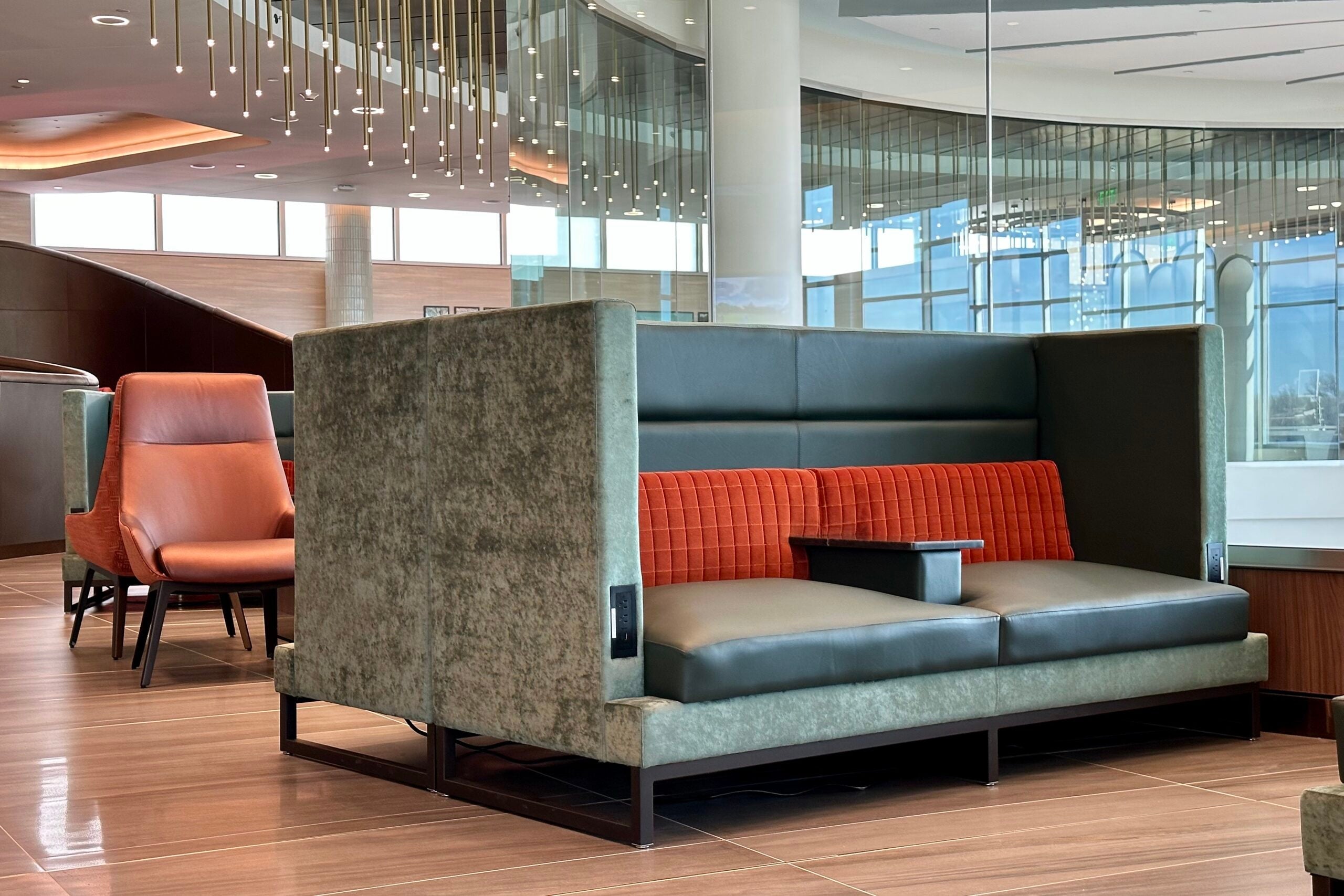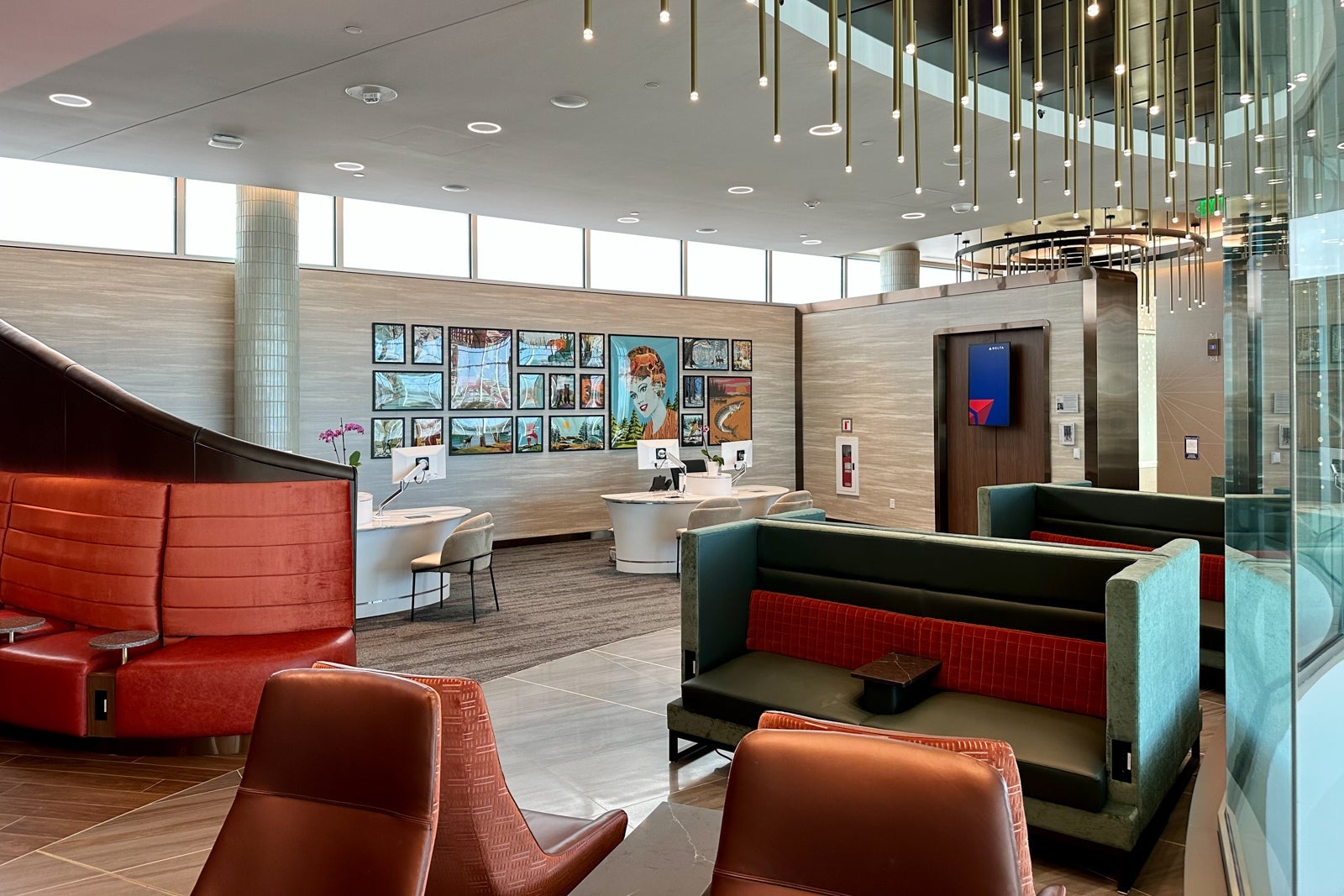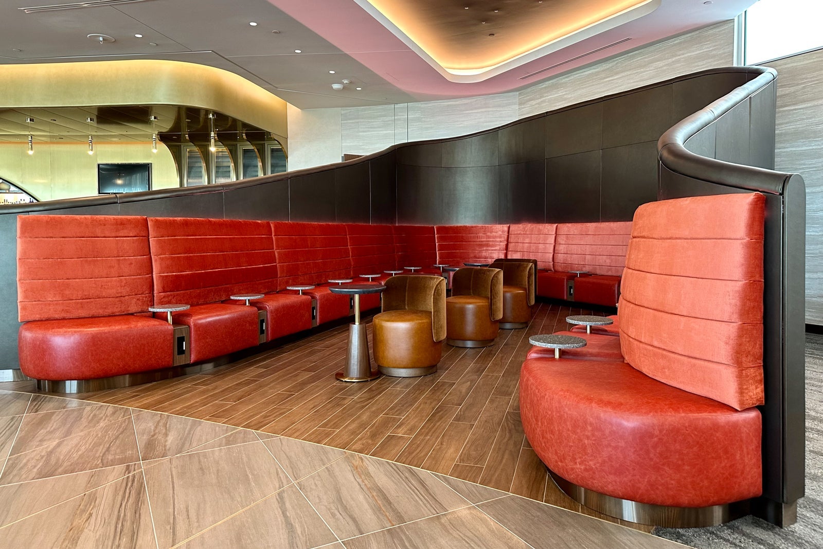 That said, you'll still find a pop of Delta signature colors throughout the lounge, including on the red-lined chairs that make up the visually appealing U-shaped sitting nook near the bar.