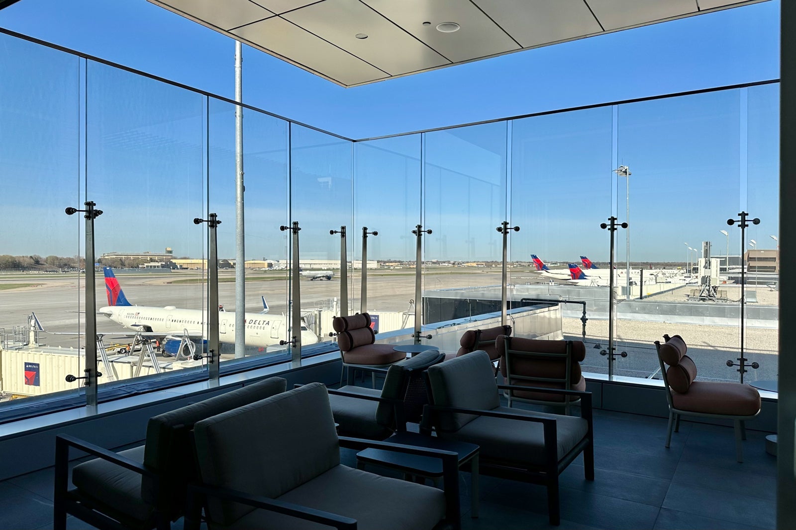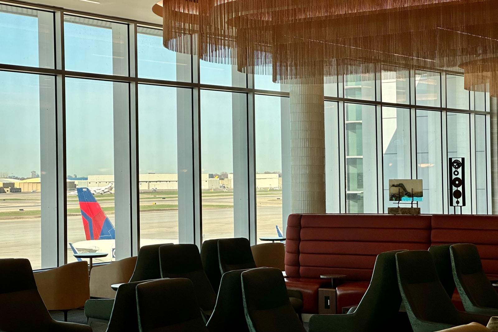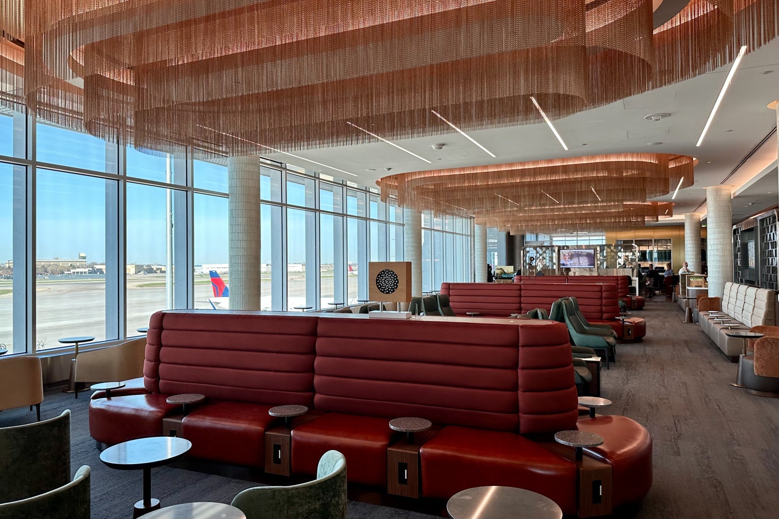 That said, you'll still find a pop of Delta signature colors throughout the lounge, including on the red-lined chairs that make up the visually appealing U-shaped sitting nook near the bar.