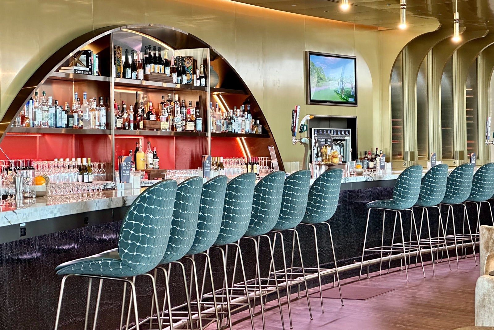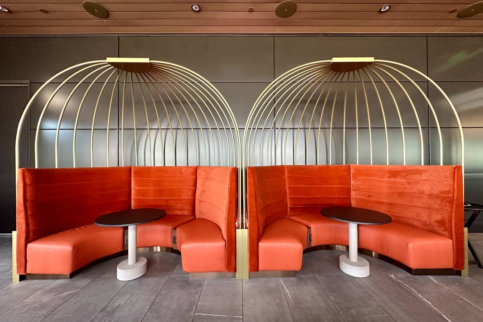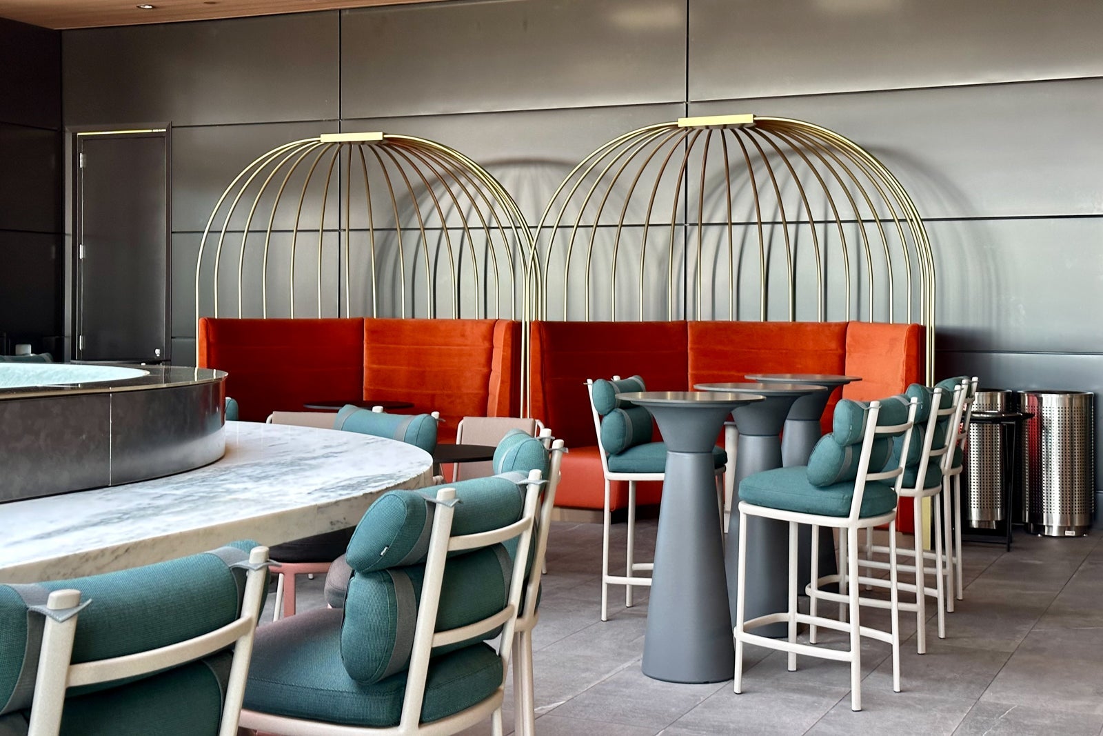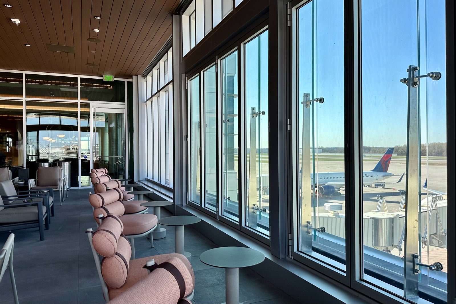 That said, you'll still find a pop of Delta signature colors throughout the lounge, including on the red-lined chairs that make up the visually appealing U-shaped sitting nook near the bar.