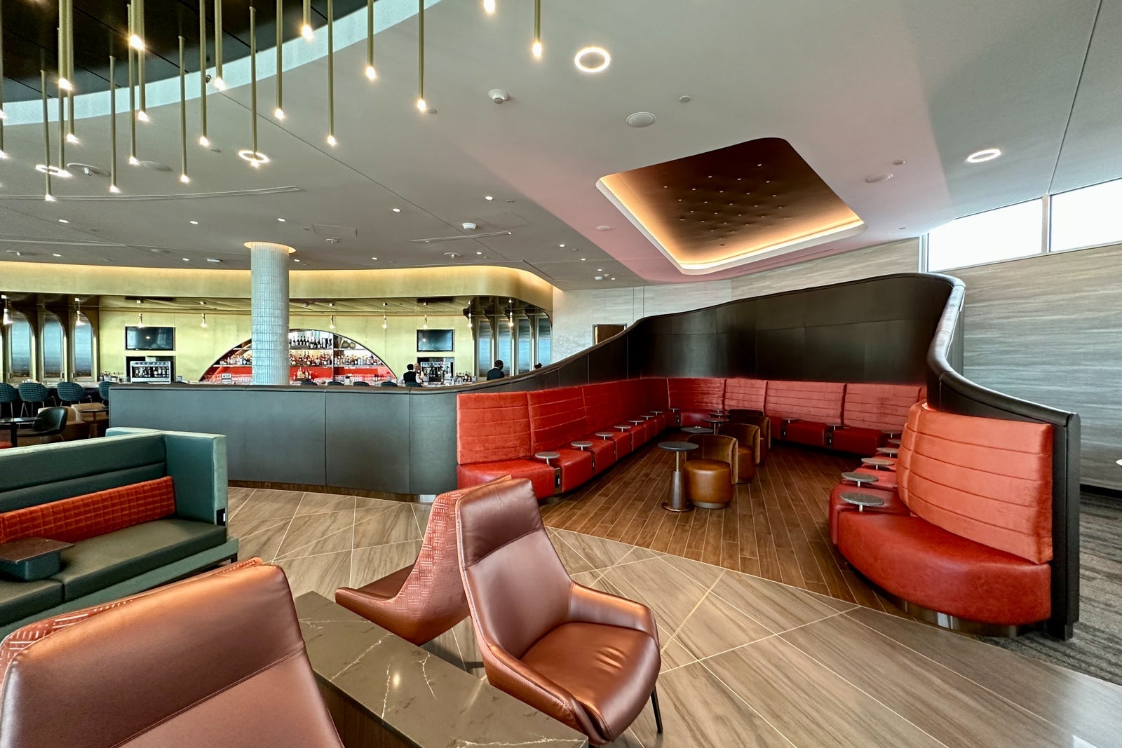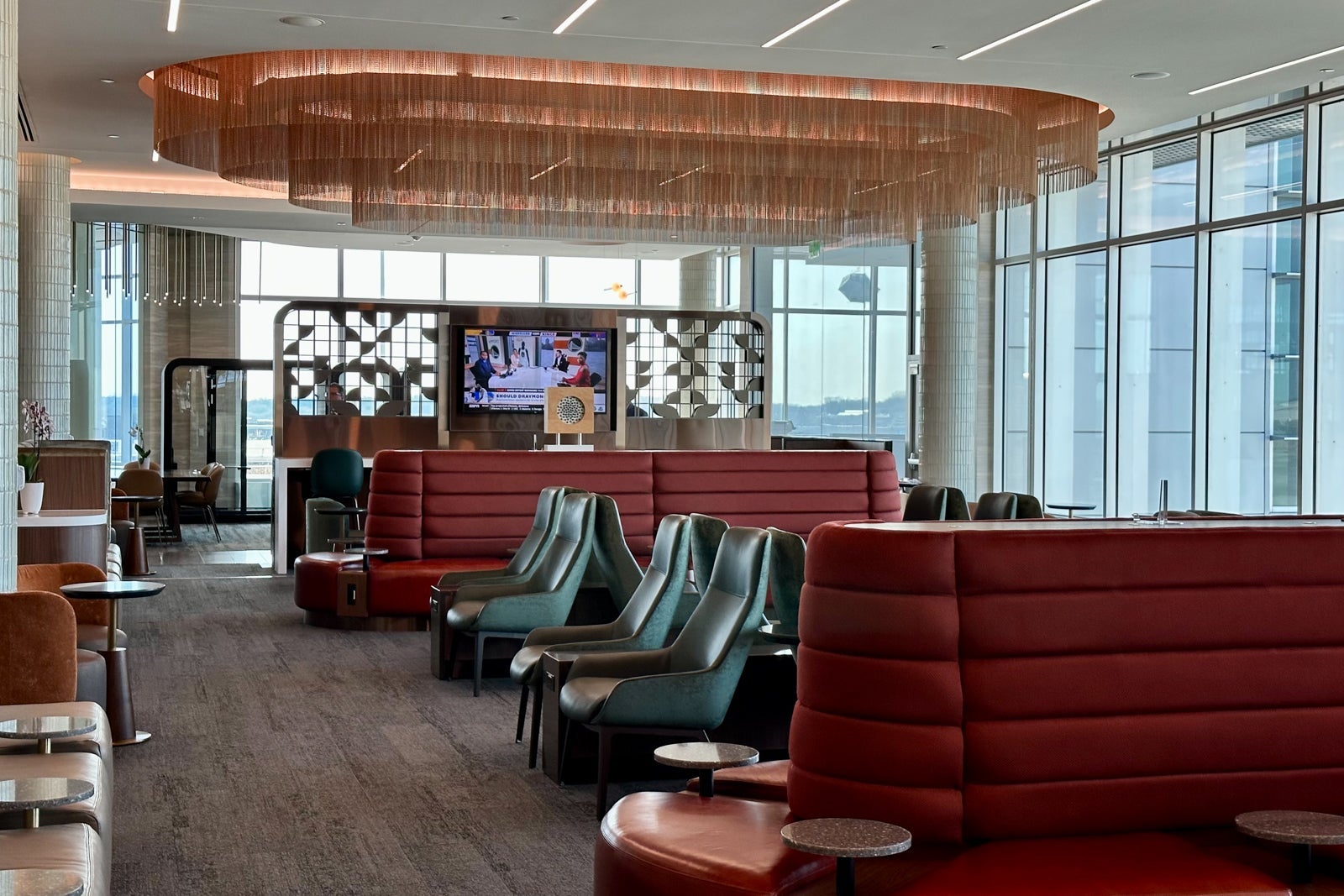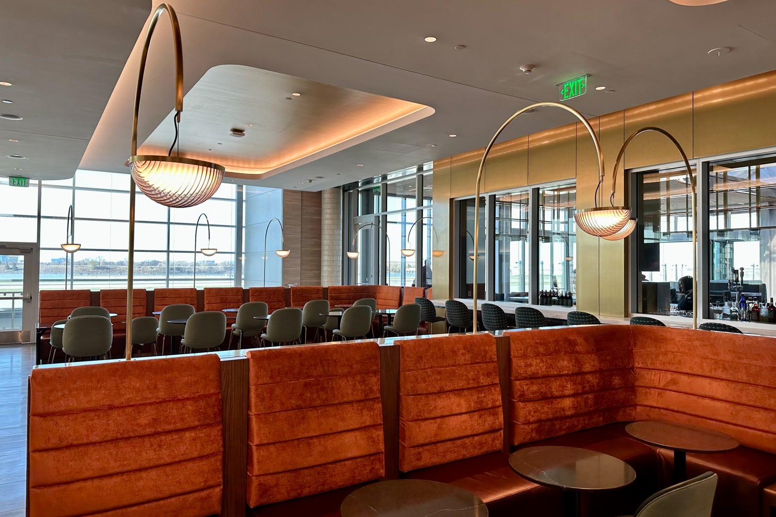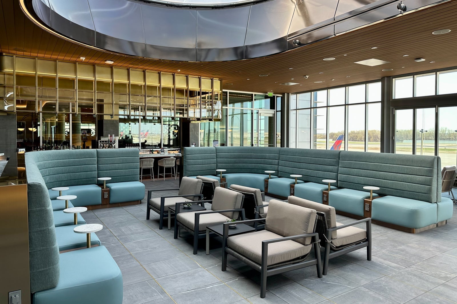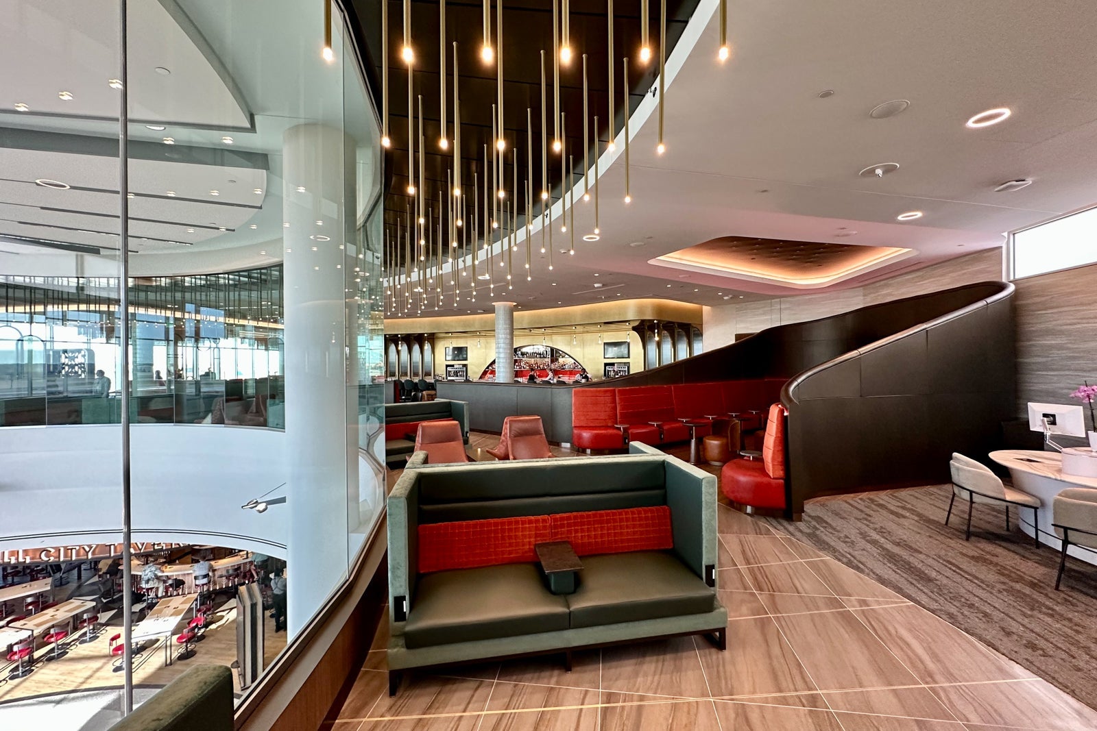 This part of the lounge is shaped like a semi-circle that spans the perimeter of the central rotunda area. The couches lining the glass walls are sure to be popular with groups who want to relax near the lounge entrance.