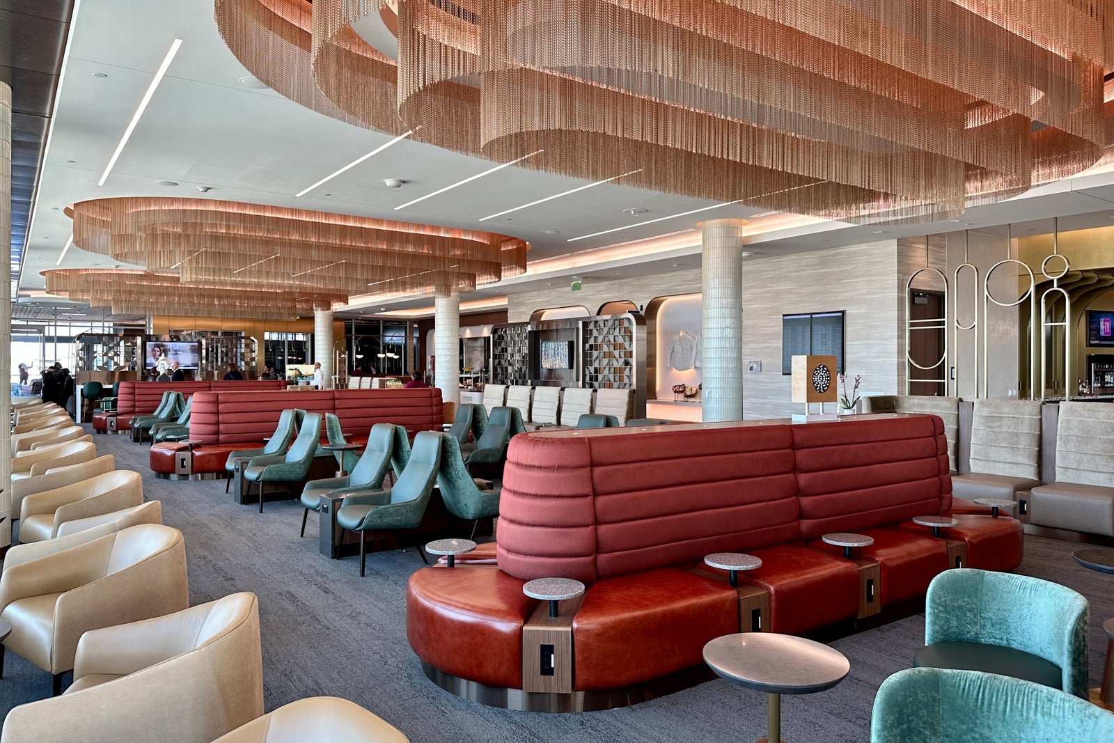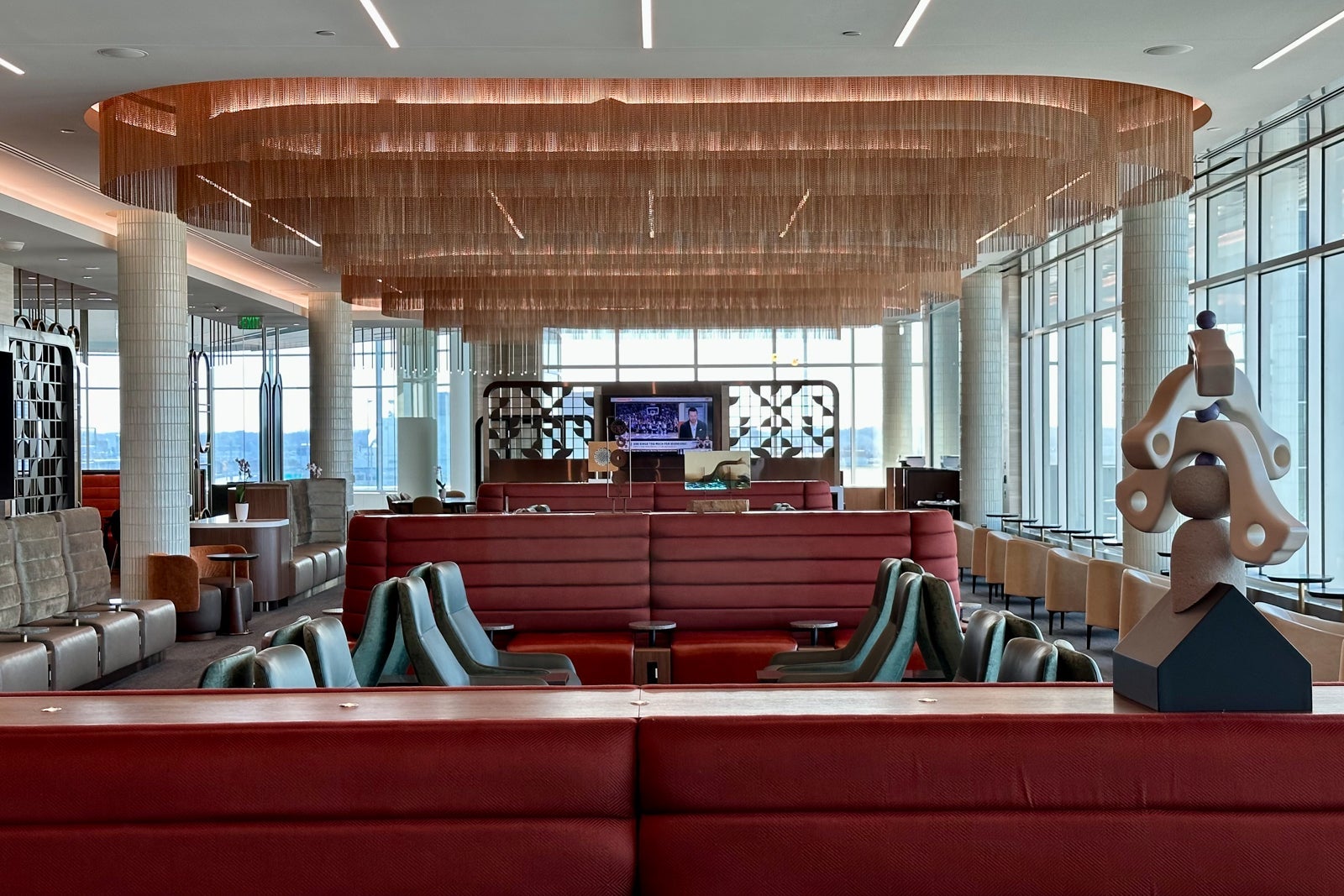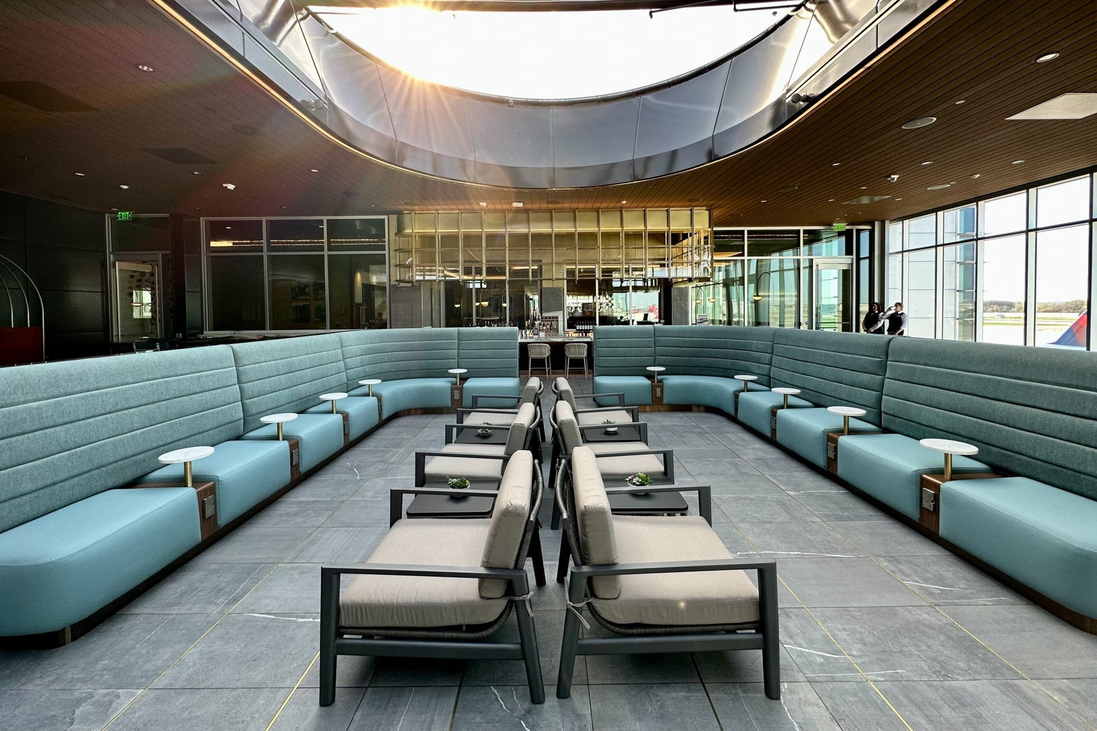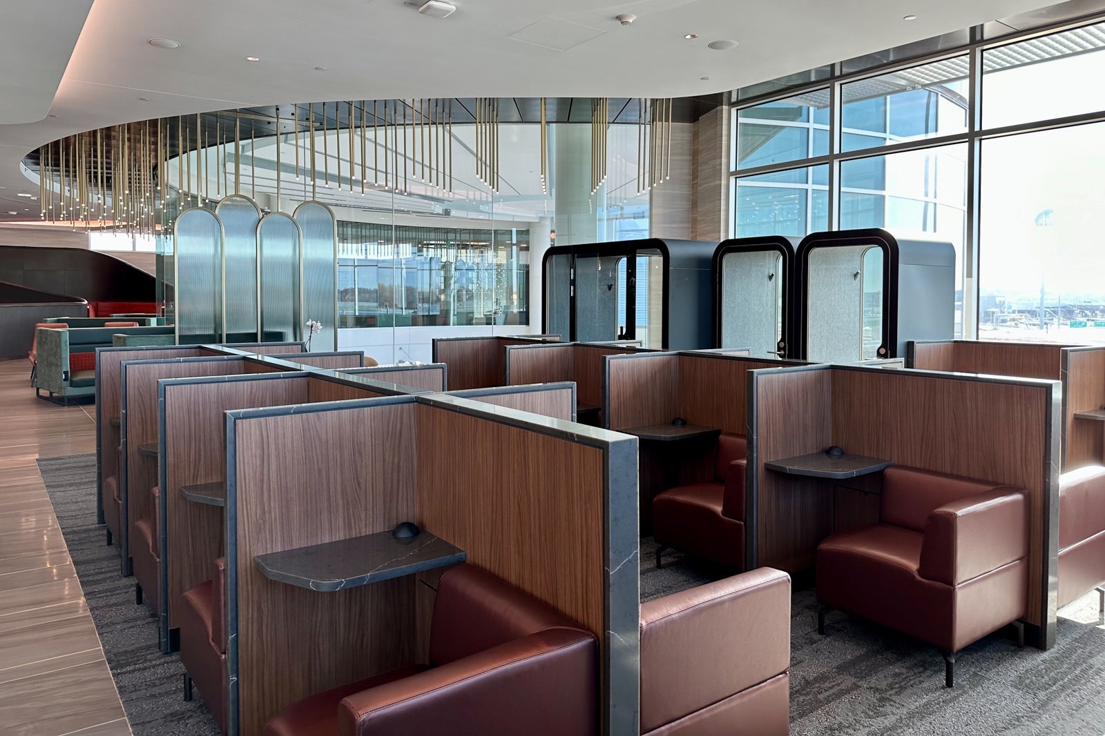 This part of the lounge is shaped like a semi-circle that spans the perimeter of the central rotunda area. The couches lining the glass walls are sure to be popular with groups who want to relax near the lounge entrance.