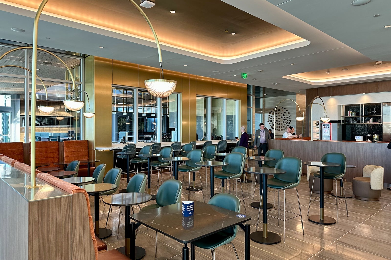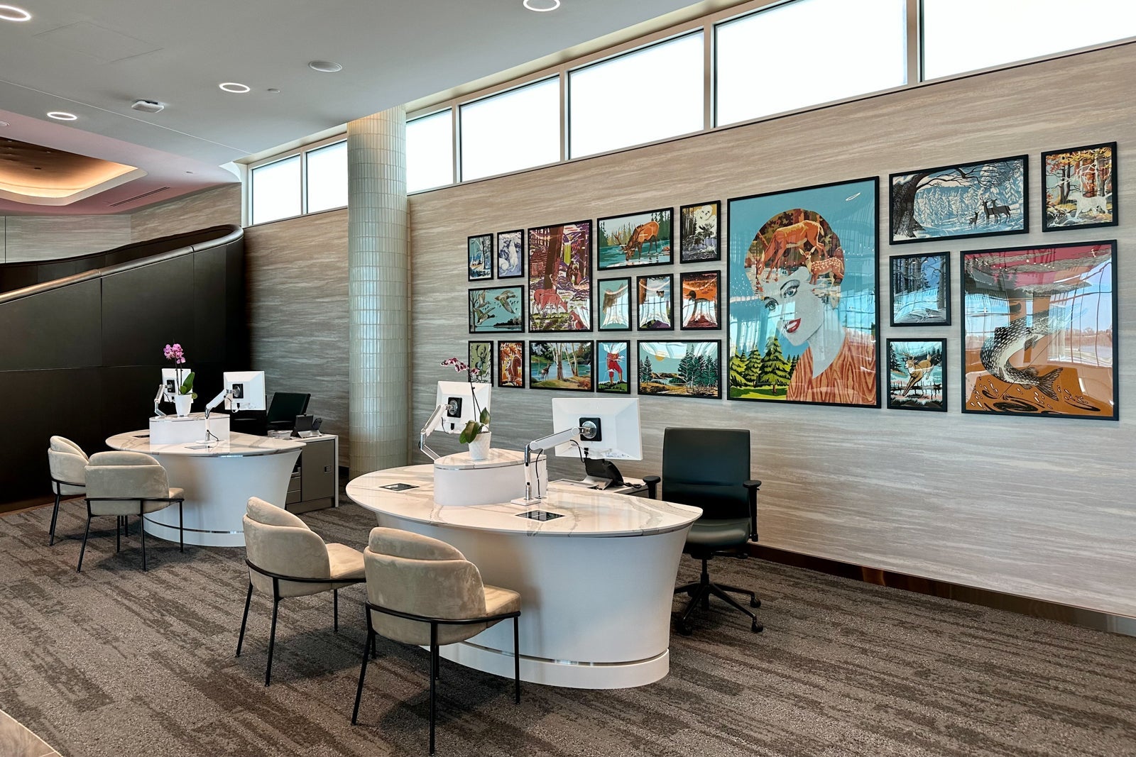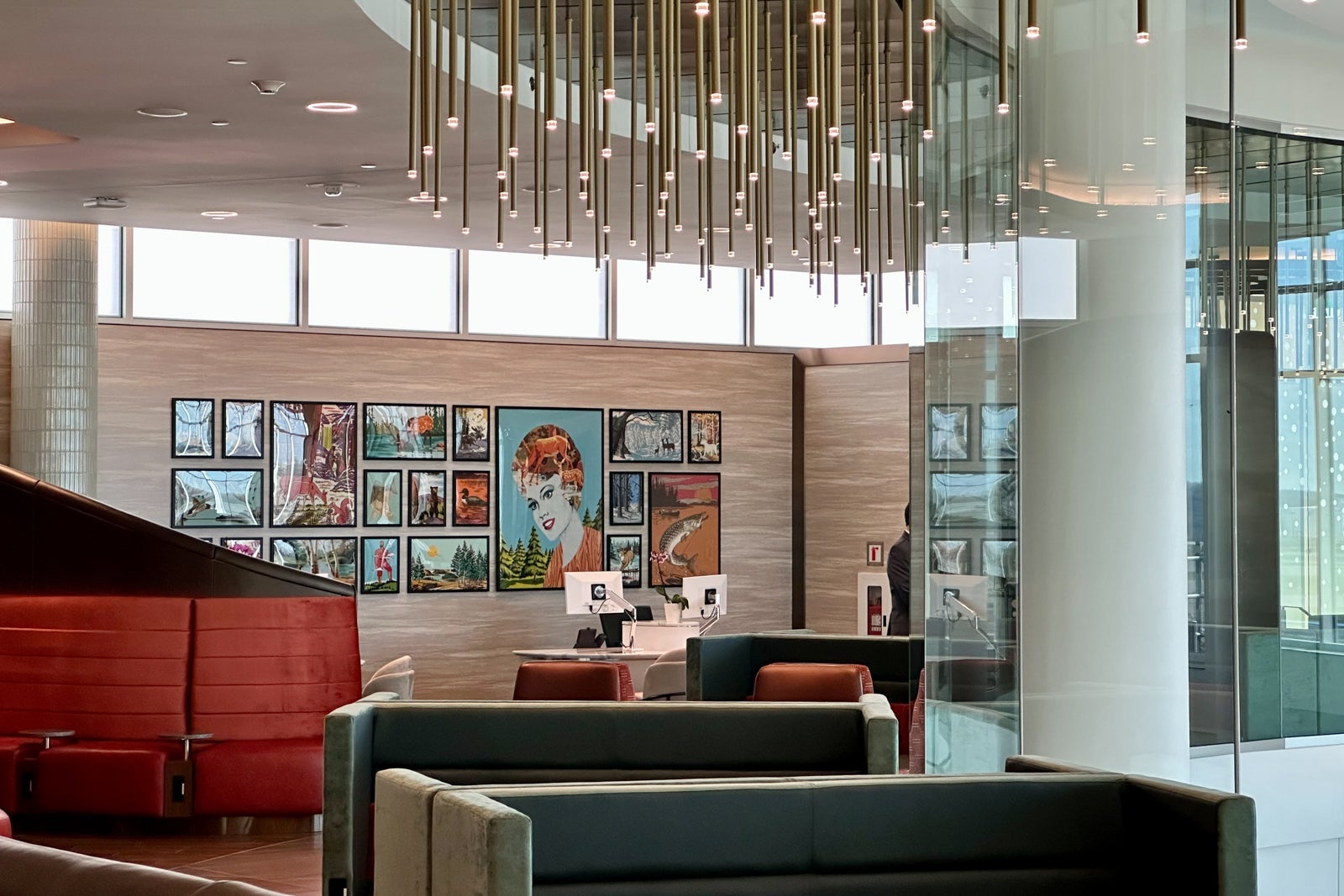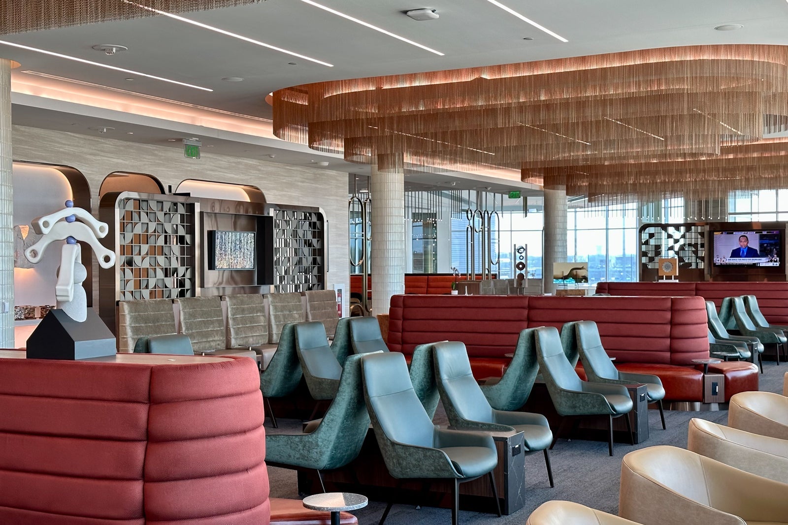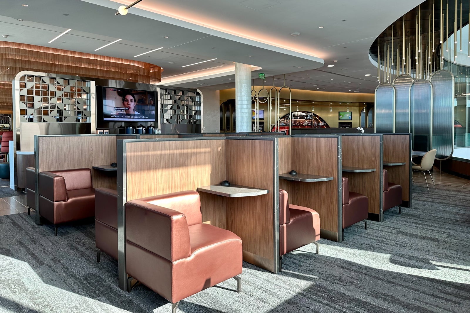 This part of the lounge is shaped like a semi-circle that spans the perimeter of the central rotunda area. The couches lining the glass walls are sure to be popular with groups who want to relax near the lounge entrance.