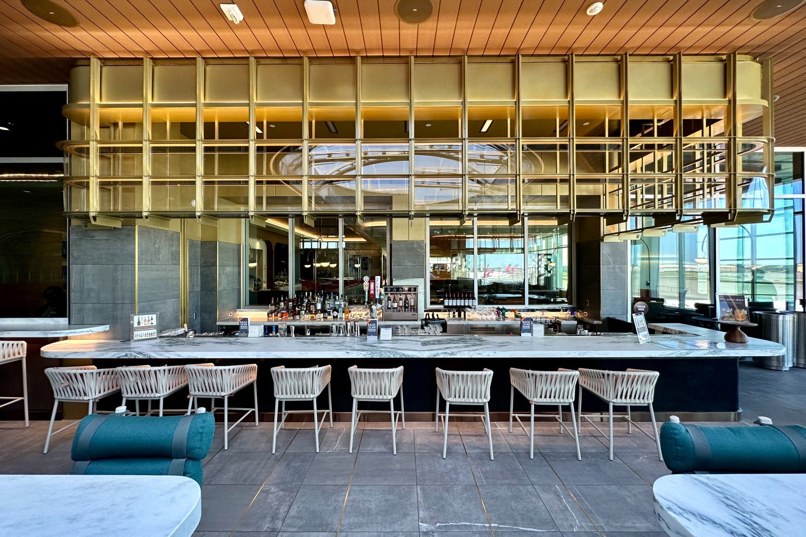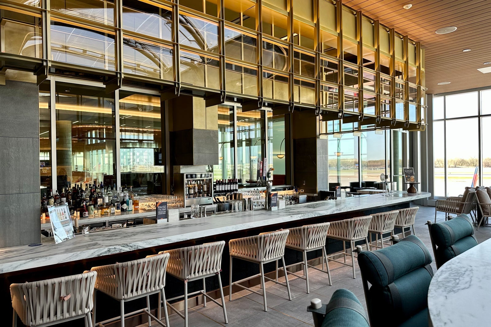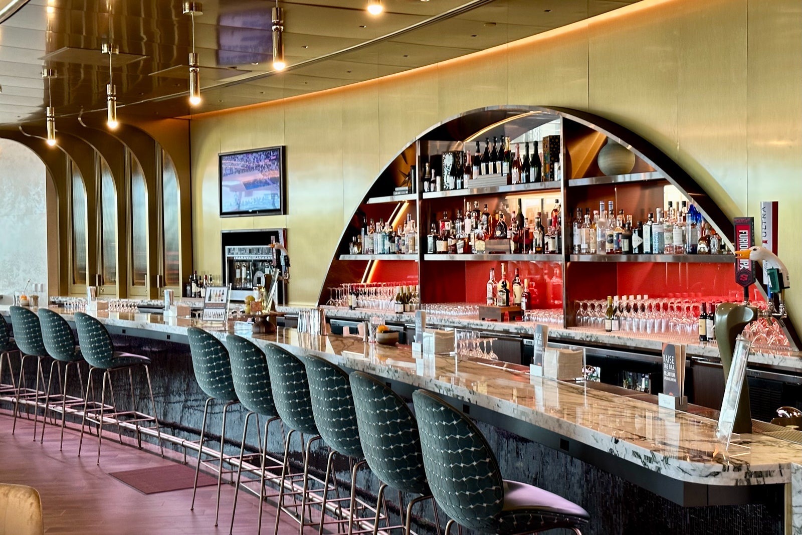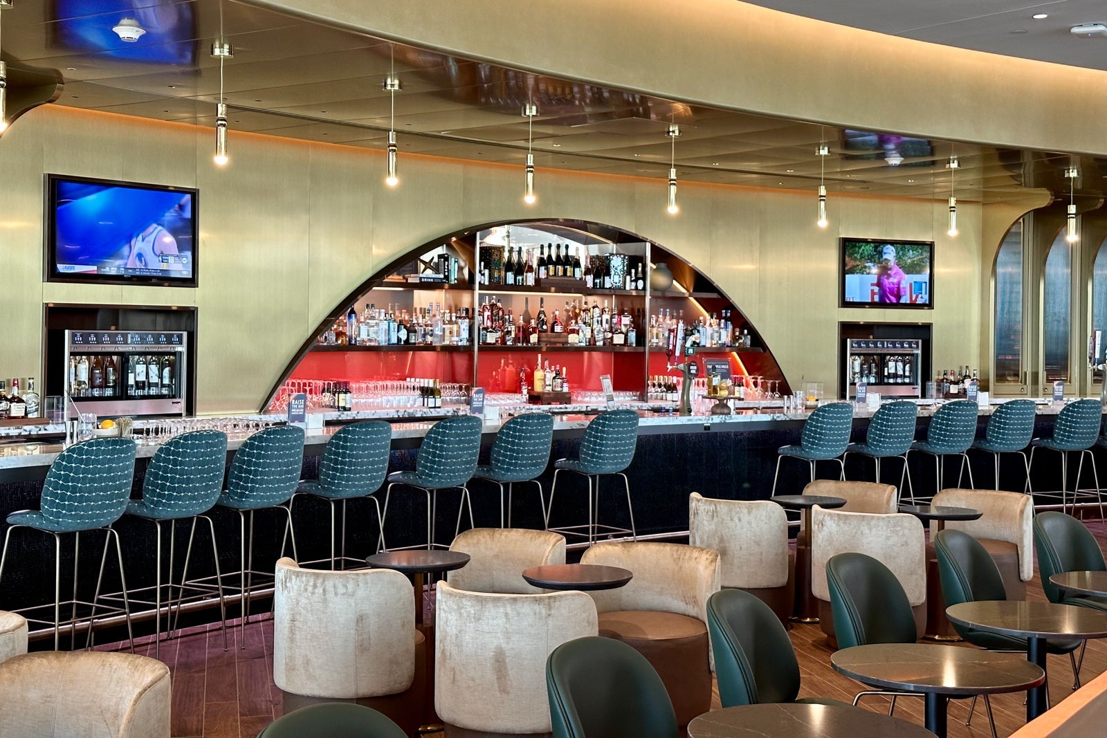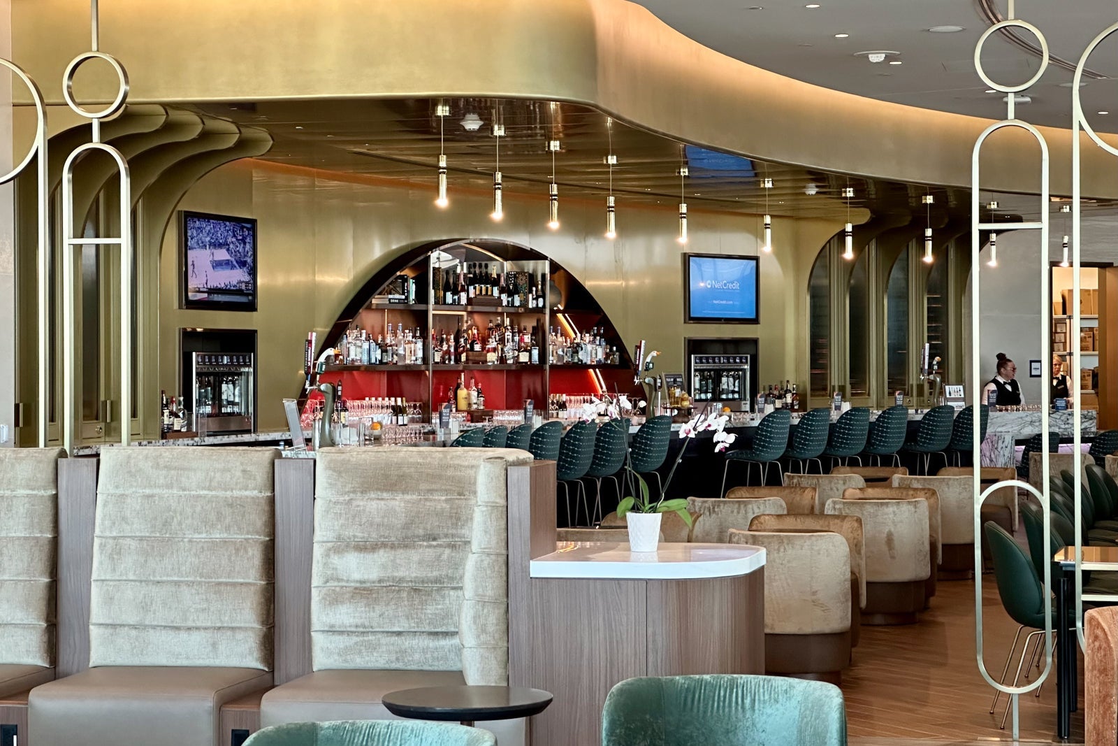You'll find the lounge's signature bar just as you enter the main relaxation area. It's easily one of the largest in the Sky Club network, and the bronze finishes contrast perfectly with the dark-green barstools and the gold lights hanging from the ceiling.