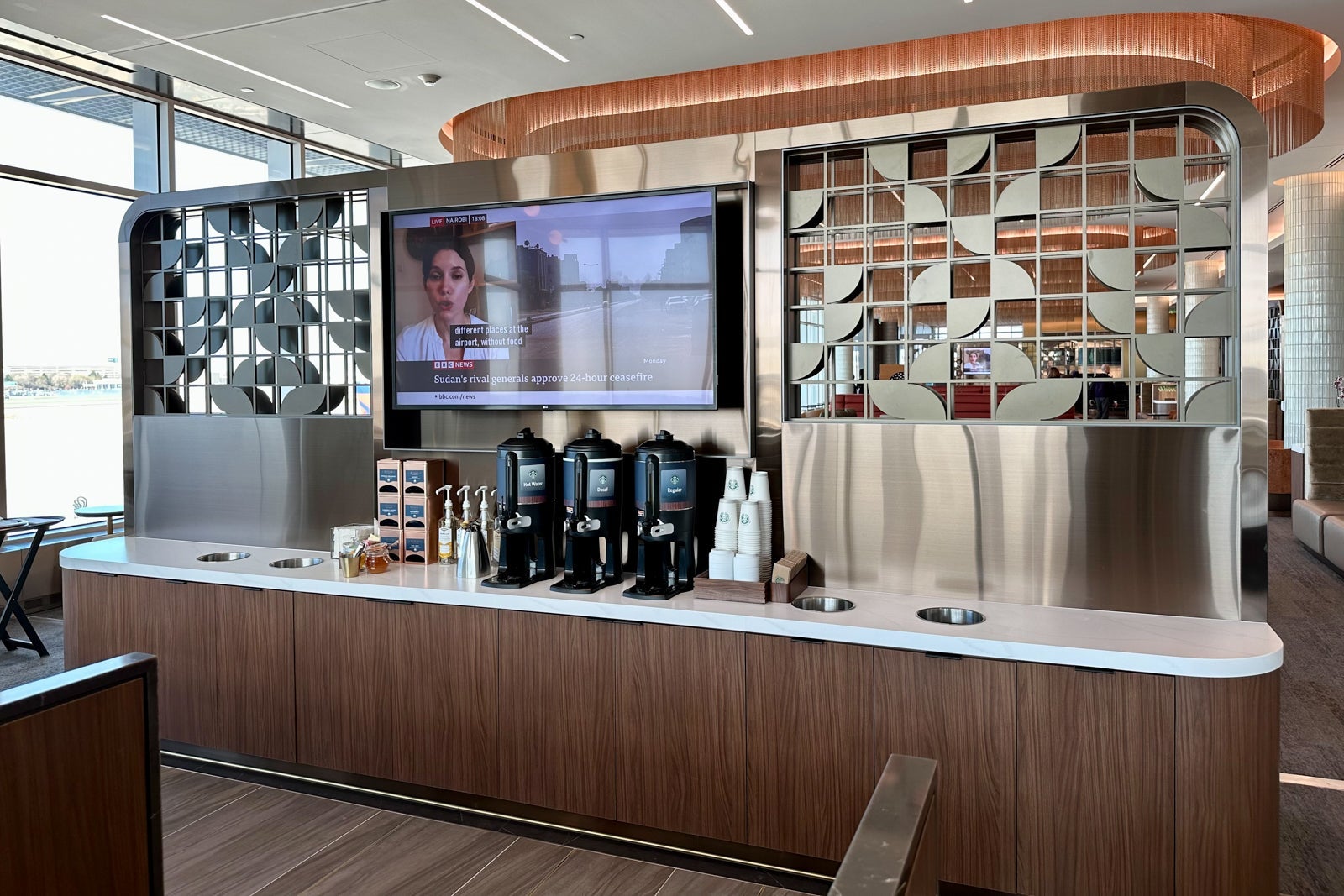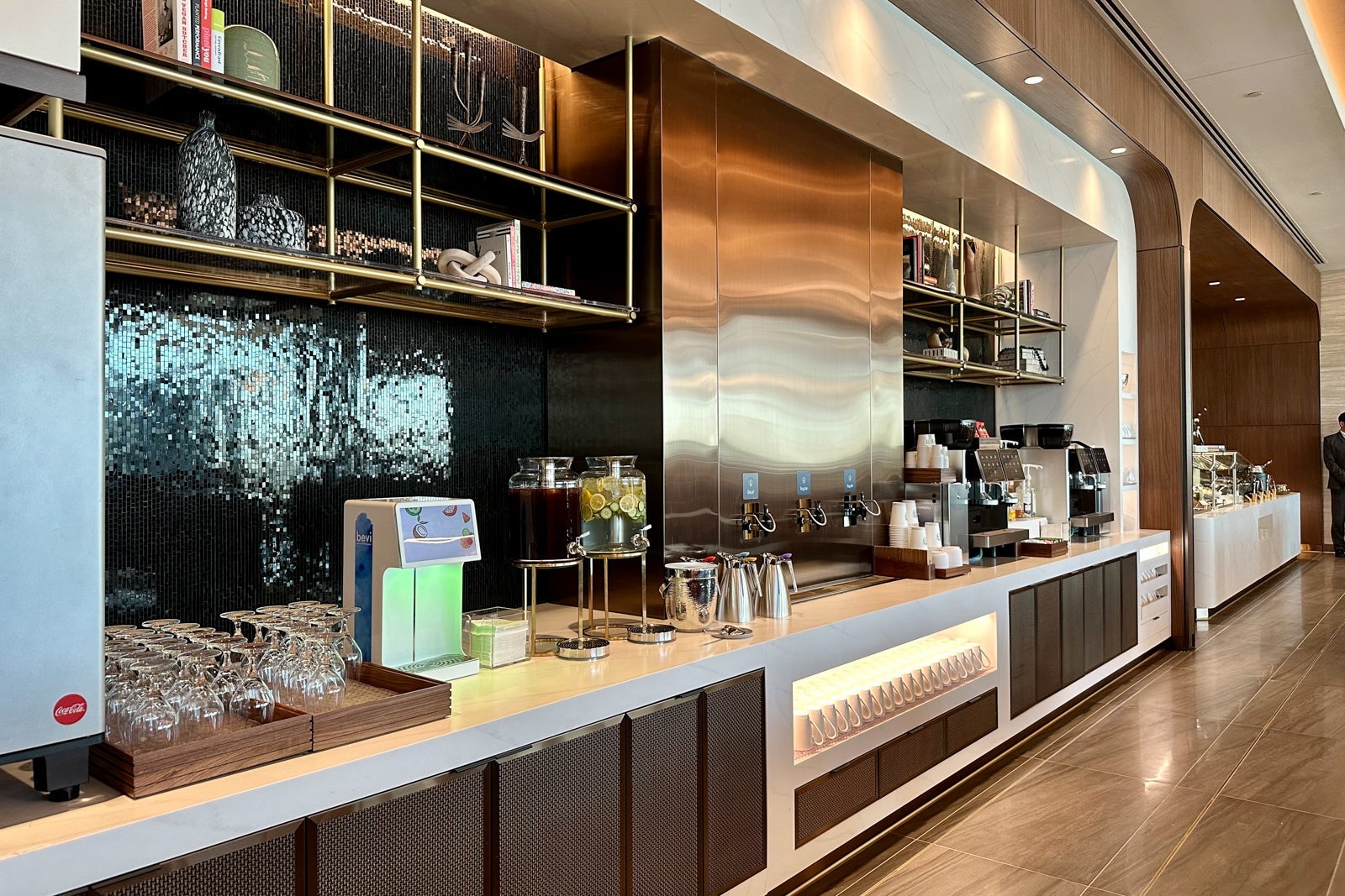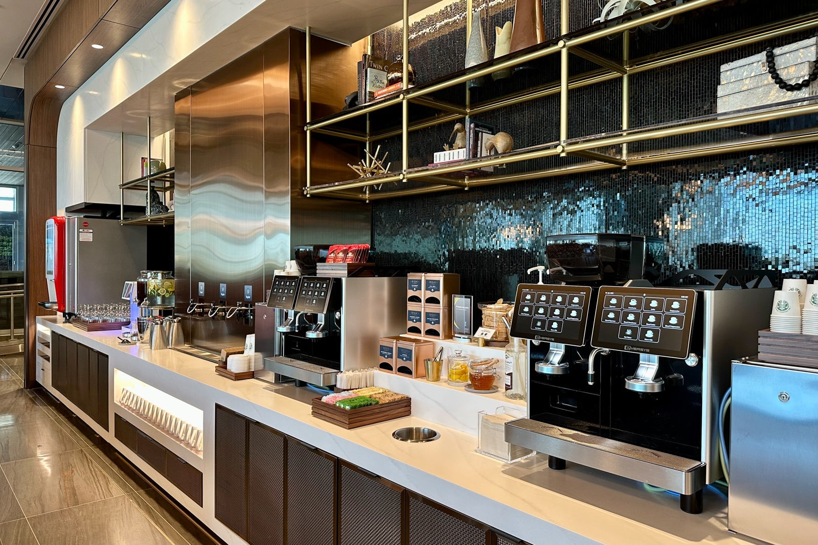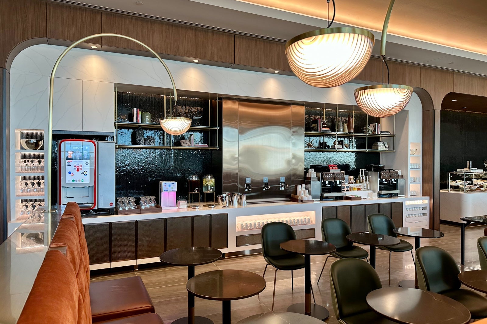 The dining room is also where you'll find the lounge's main beverage station, which features a Coca-Cola Freestyle machine, Bevi water dispenser, Starbucks coffee and two Eversys coffee machines.