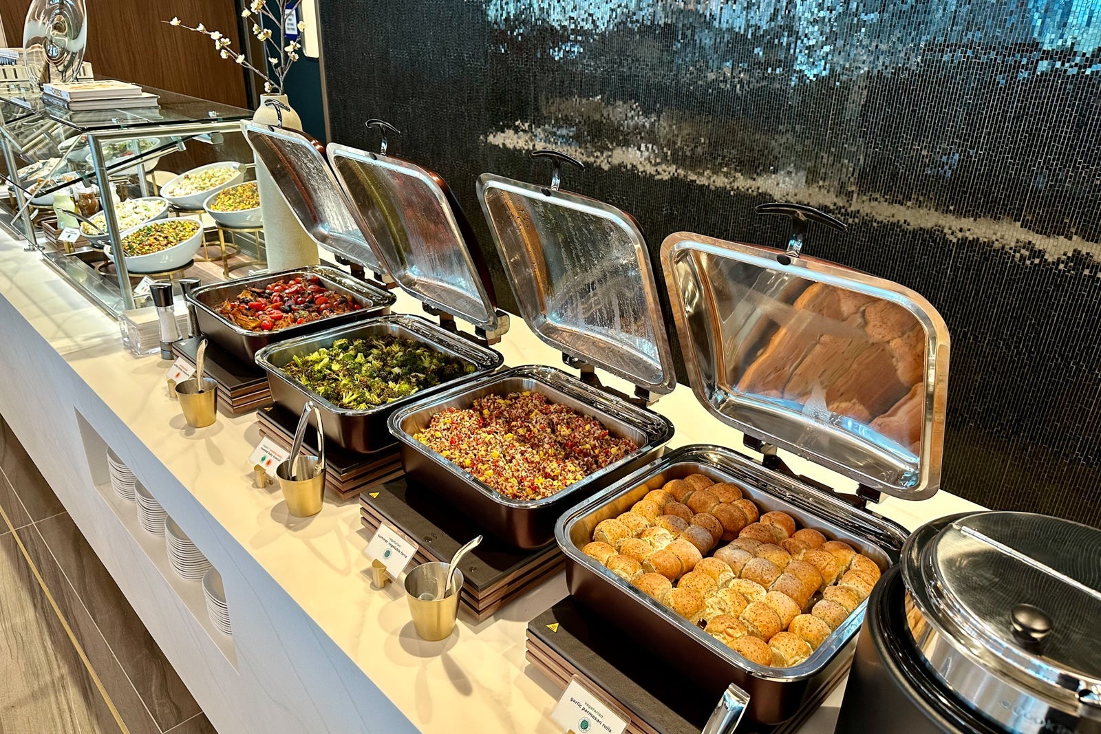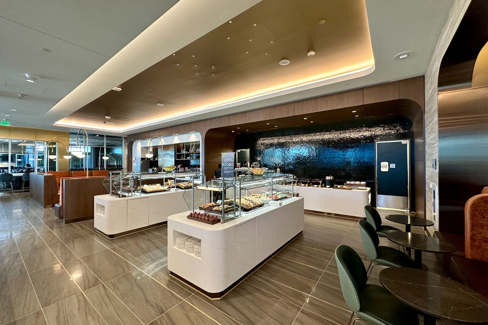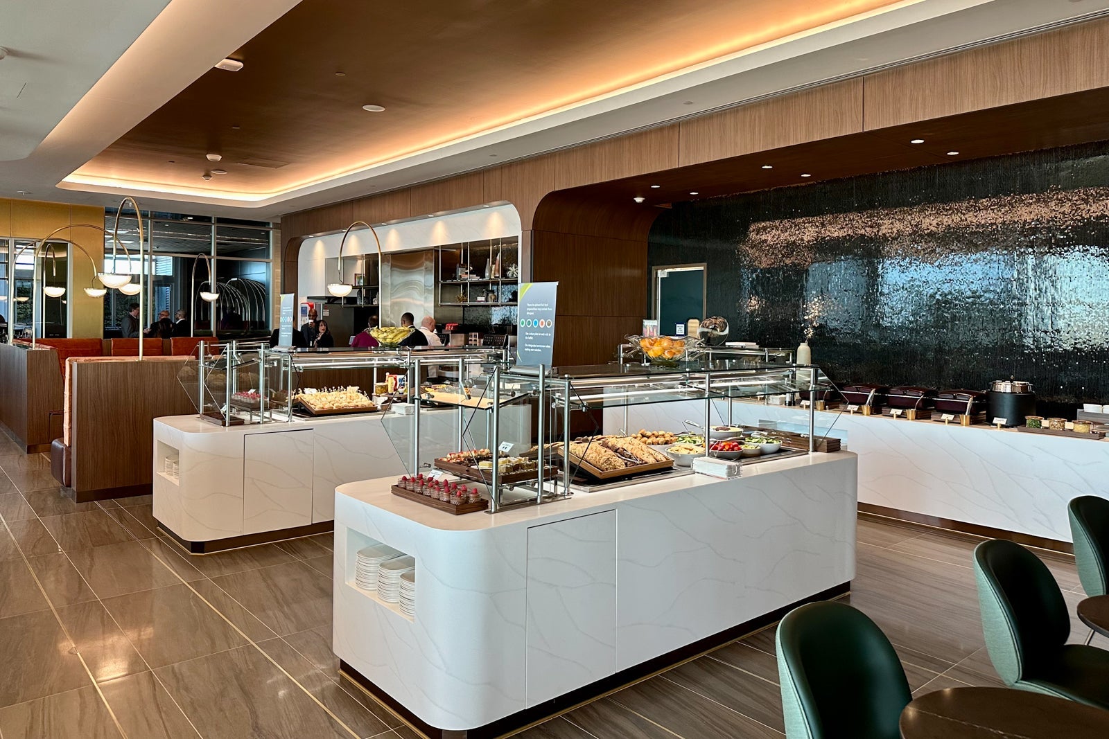 The lounge's buffet is at the back of the relaxation area. The marble-clad action stations don't just look great — their culinary offerings are also some of the best you'll find in any airport lounge.