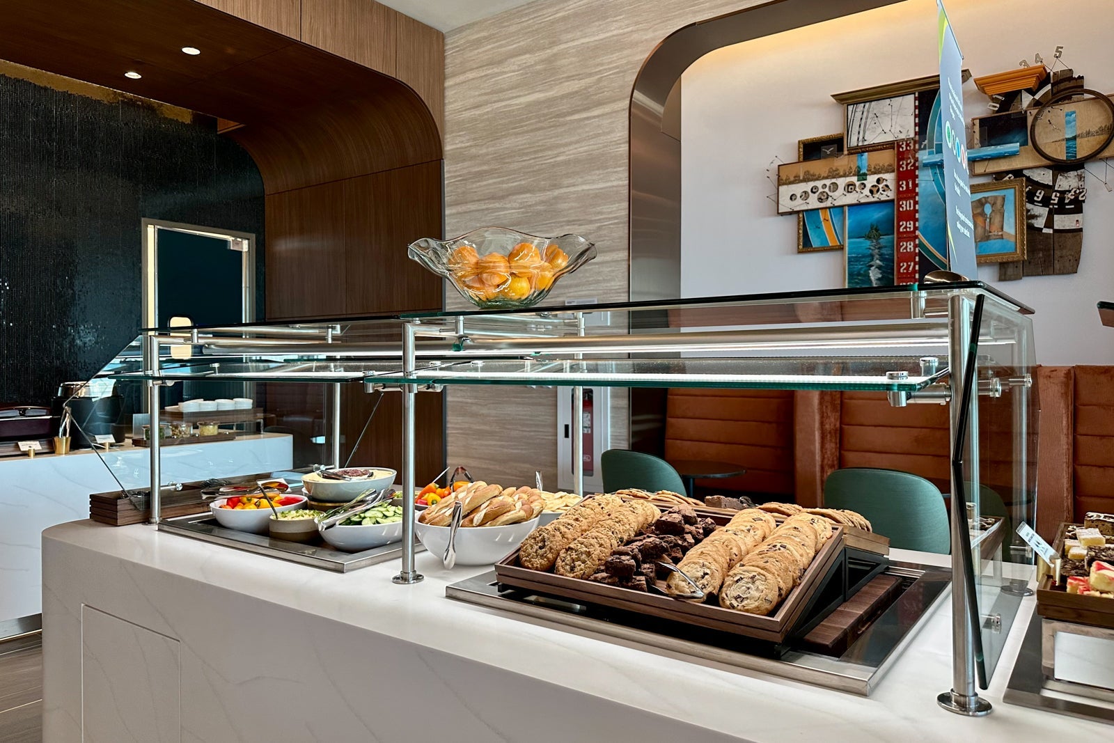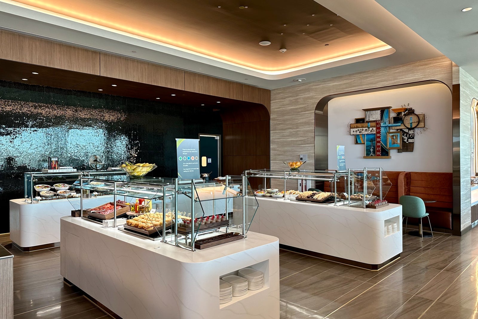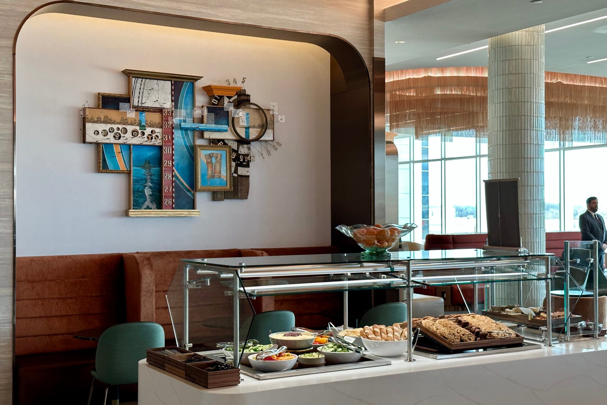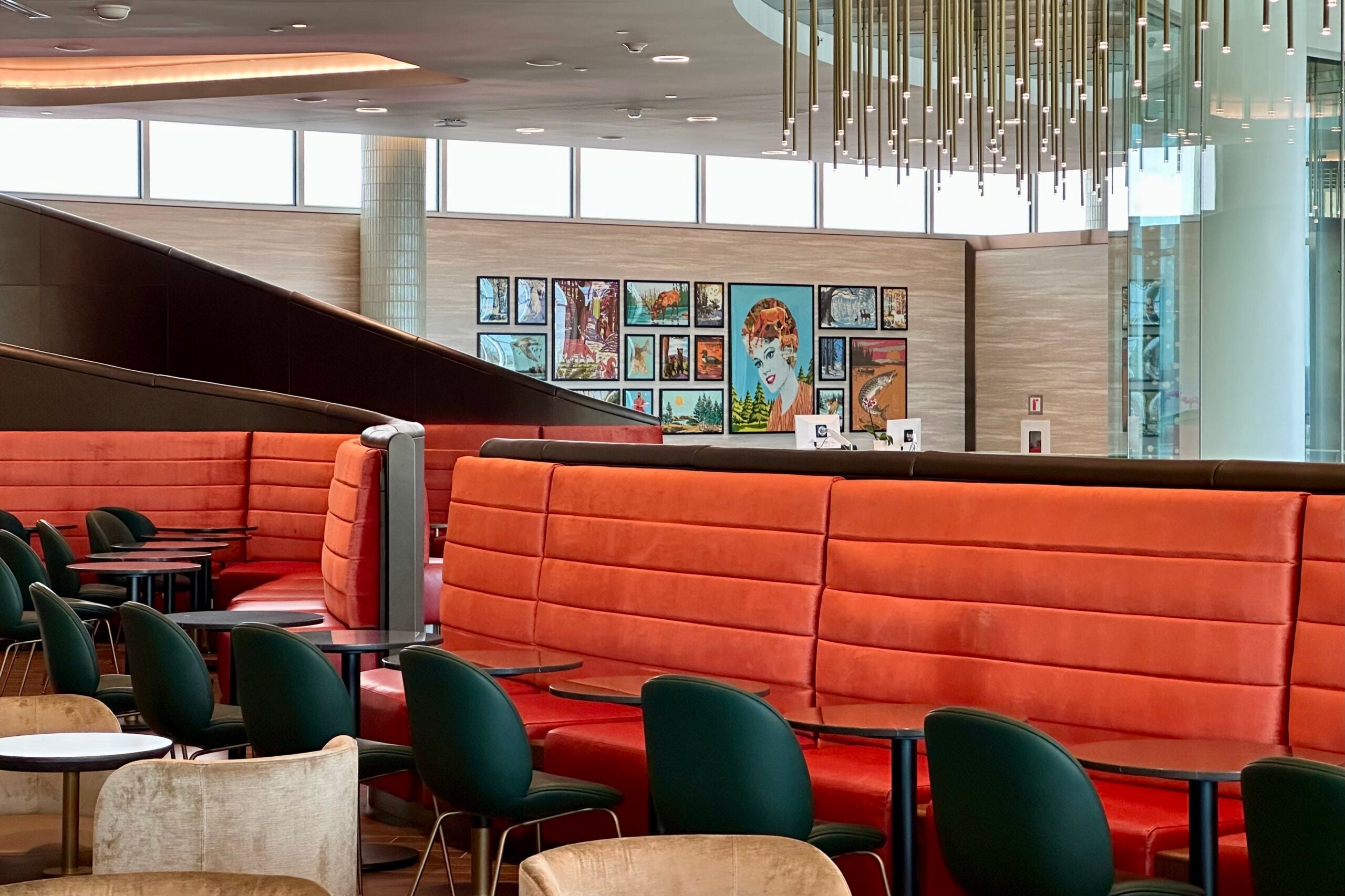 While you might be focused on grabbing some food (or catching a flight), you may want to take a moment to appreciate the design of the dining room. One highlight is the artwork hanging next to the buffet — "Seagulls Have No Use for Satellites" — that encourages viewers to slow down from all the distractions in their lives.
