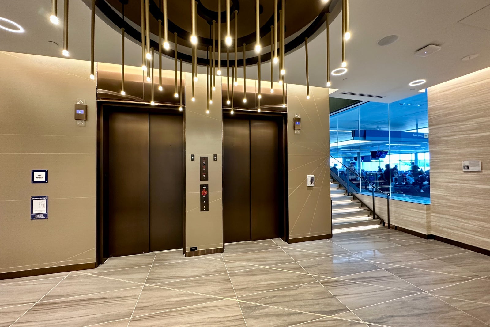Once inside, there are two elevators and a staircase to take you to the lounge. Delta does a great job with the details. Thanks to some colorful artwork, a beautiful chandelier and spacious elevators, this entrance area feels more like a five-star hotel lobby than an airport hold room.