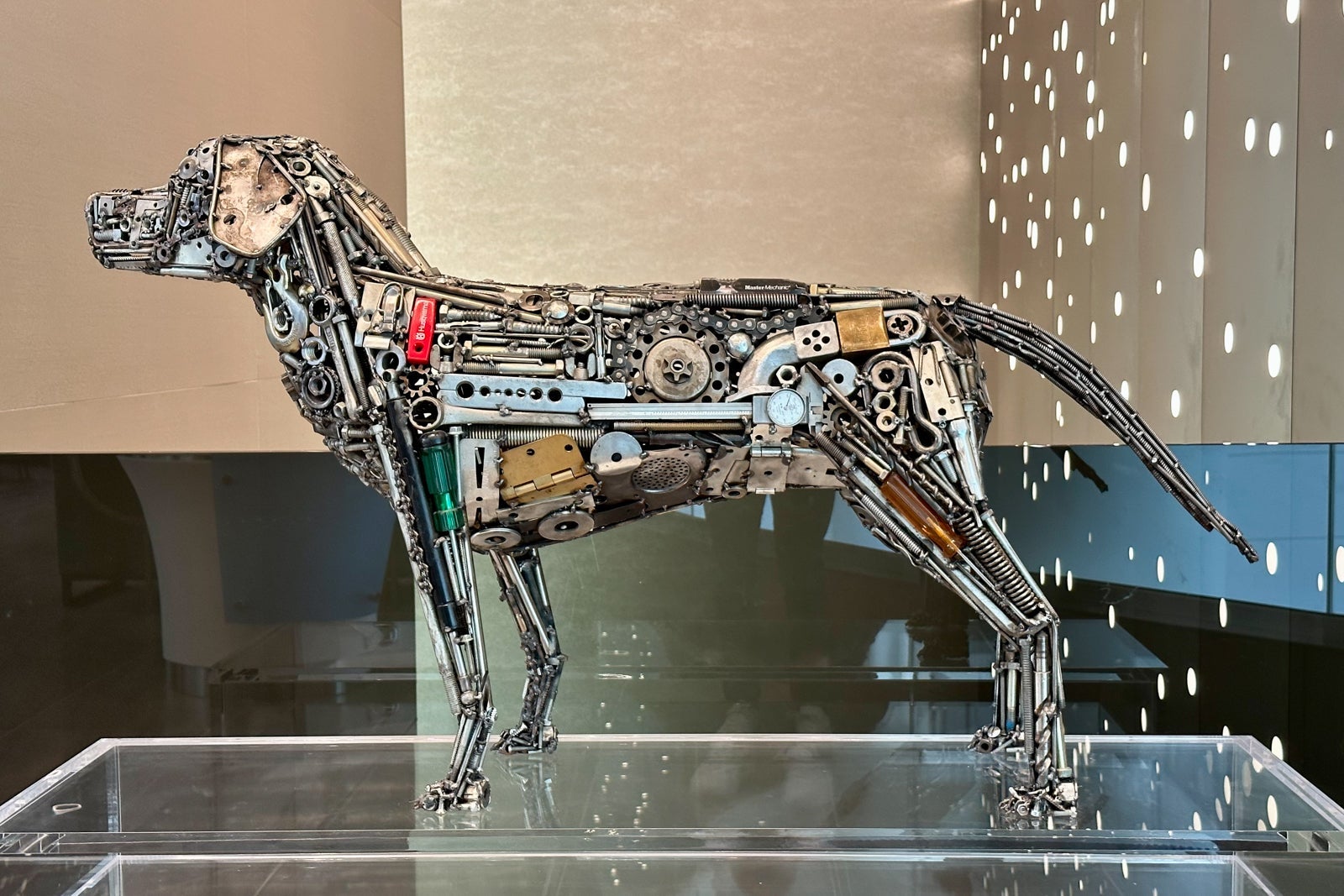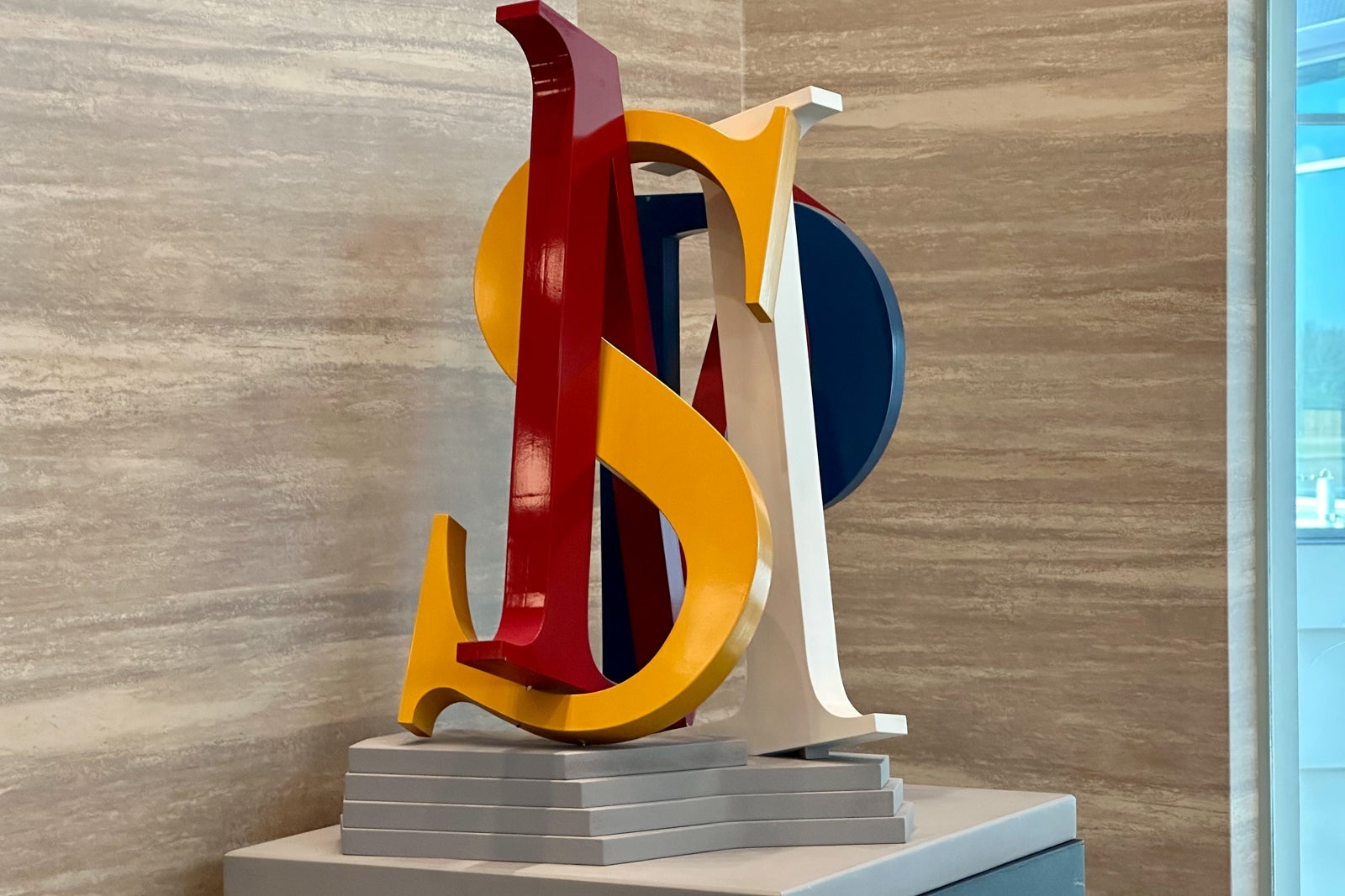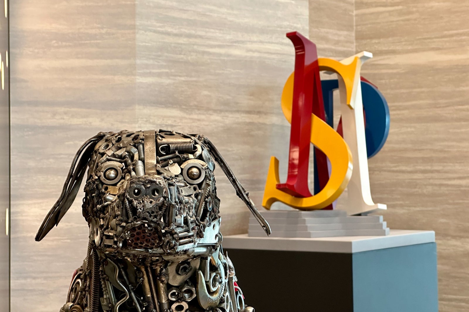 This area is also home to my favorite artwork in the entire space, "Minneapolis." I'm a fan of calling cities by their airport codes, and Dennis Kalow's take on Minneapolis incorporates a large M, S and P interwoven in enameled wood and painted in red, white and gold.