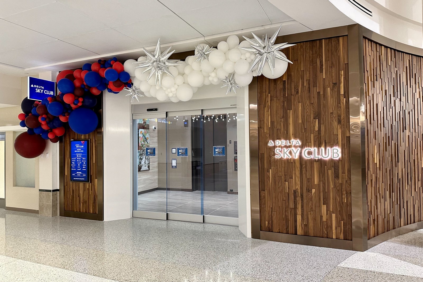 The entrance is located on the ground level of the central rotunda, and it's nearly impossible to miss because of the wood-grain wall and backlit Delta Sky Club branding.