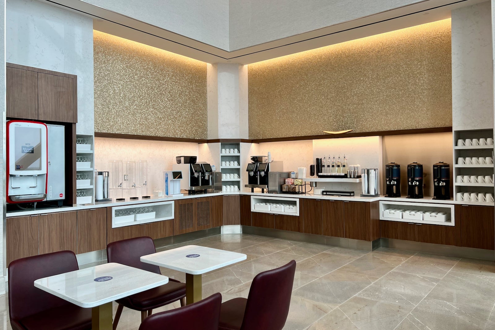 Each buffet is also flanked by a hydration station with Eversys coffee machines, a Coca-Cola freestyle machine and a Bevi water tap.